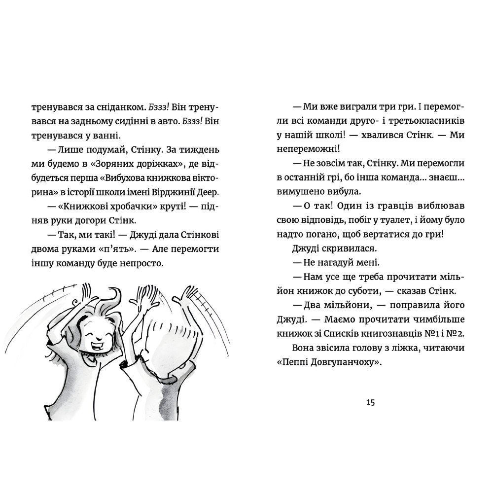 Джуди Муди мечтает о победе. Вместе с командой «Книжных червячков» из школы имени Вирджинии Деер она готовится к «Взрывной книжной викторине» и мечтает получить Кубок книжников! К чему только не удается Джуди, чтобы лучше подготовиться к викторине и перечитать безумно много книг. А вот свисает головой вниз, как Пеппи Долгачулок, или учится быстро чтению. Но поможет ли ей это добыть в борьбе кубок у «Защитников-кровопивц с искусственными усами» из Академии разума? Ведь в команде противников сильная соперница-четвертоклассница.