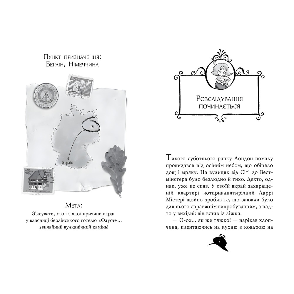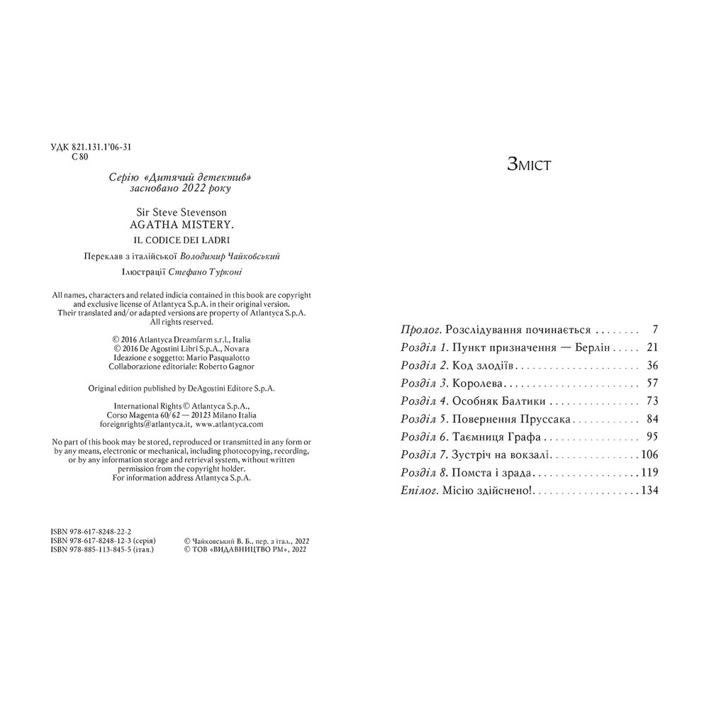 Наделенная изумительным чутьем и феноменальной памятью, Агата Мистери мечтает стать писательницей, но это в будущем. Пока что она – отличный детектив! Вместе с простоватым кузеном Ларри, студентом школы детективов, Агата путешествует по миру, разгадывая самые запутанные тайны. Помогают им преданный мажордом, пакостный сибирский кот и уйма странных родственников. Код воров У владелицы берлинского отеля кто-то похитил унаследованный от отца вулканический камень. Агата и Ларри озадачены: зачем воровать довольно распространенный в природе минерал? Выяснить это они должны в самом Берлине, распутывая дело, тянущееся из полного тайн прошлого, где были и секретные коды, и контрабанда.