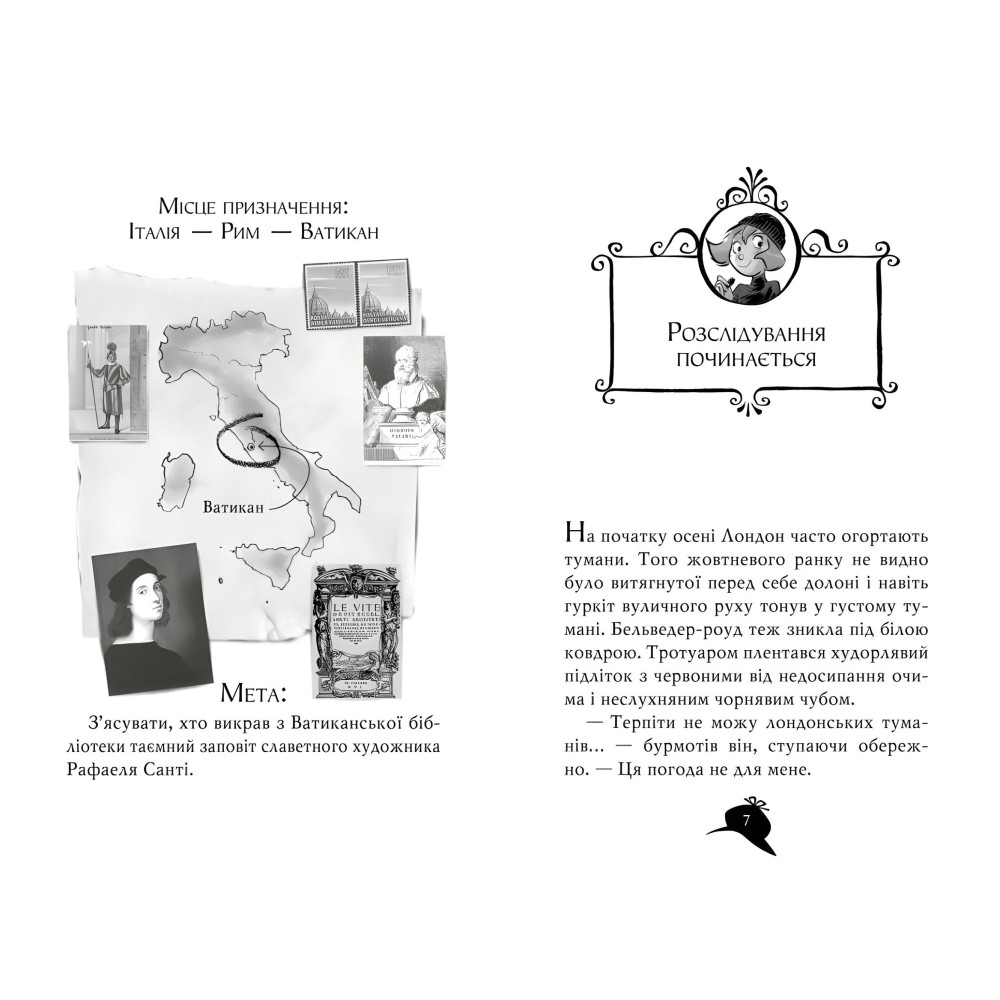 Наделенная изумительным чувством и феноменальной памятью, Агата Мистери мечтает стать писательницей, но это в будущем. Пока что она – отличный детектив! Вместе с простоватым кузеном Ларри, студентом школы детективов, она путешествует по миру, разгадывая самые запутанные тайны. Помогают им преданный мажордом, пакостный сибирский кот и уйма странных родственников. Кража в Ватикане Из Секретного архива Ватикана похищено только что обнаруженное завещание Рафаэля, знаменитого итальянского художника XVI в. Агата и Ларри Мистери немедленно отправляются в Италию. К счастью, в Риме живет их дядя Алджернон – ученый-палеограф. Вместе им придется отыскать пропавшее письмо и еще и осуществить сенсационное открытие…