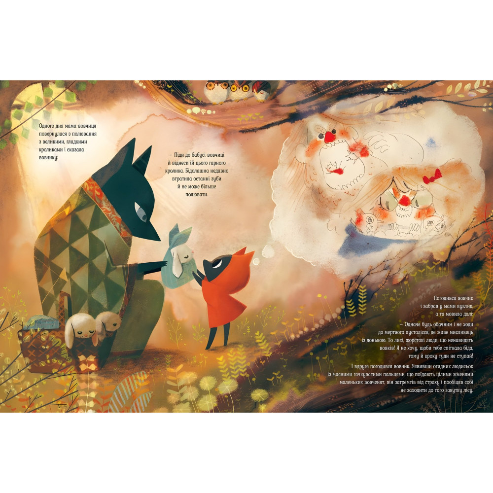 – Почему ты плачешь? Красный Вовка оглянулся. На него с любопытством смотрела маленькая, странно одетая белокурая девочка. Растерявшись, волчик вспомнил, чему его всегда учили старшие – «держаться подальше от людей!» Но маленький человек, стоявший перед ним, казался таким добрым и хрупким, что он мгновенно почувствовал к нему доверие. Давно когда-то жила мама-волчица. Однажды она отправила волчонка отнести кролика к бабушке: она совсем не имела зубов и была слишком старенькой, чтобы охотиться. По дороге волчик должен остерегаться злых людей – ужасного охотника и его дочери. Но, путешествуя, маленькая волка ужасно проголодается и, не удержавшись, соединение ест кролика. Смущенный и пристыженный своим поступком, он наивно последует за милой девочкой, которая расскажет ему историю своей семьи: о добром охотнике и его жене, которую якобы соединения ели жестокие волки...