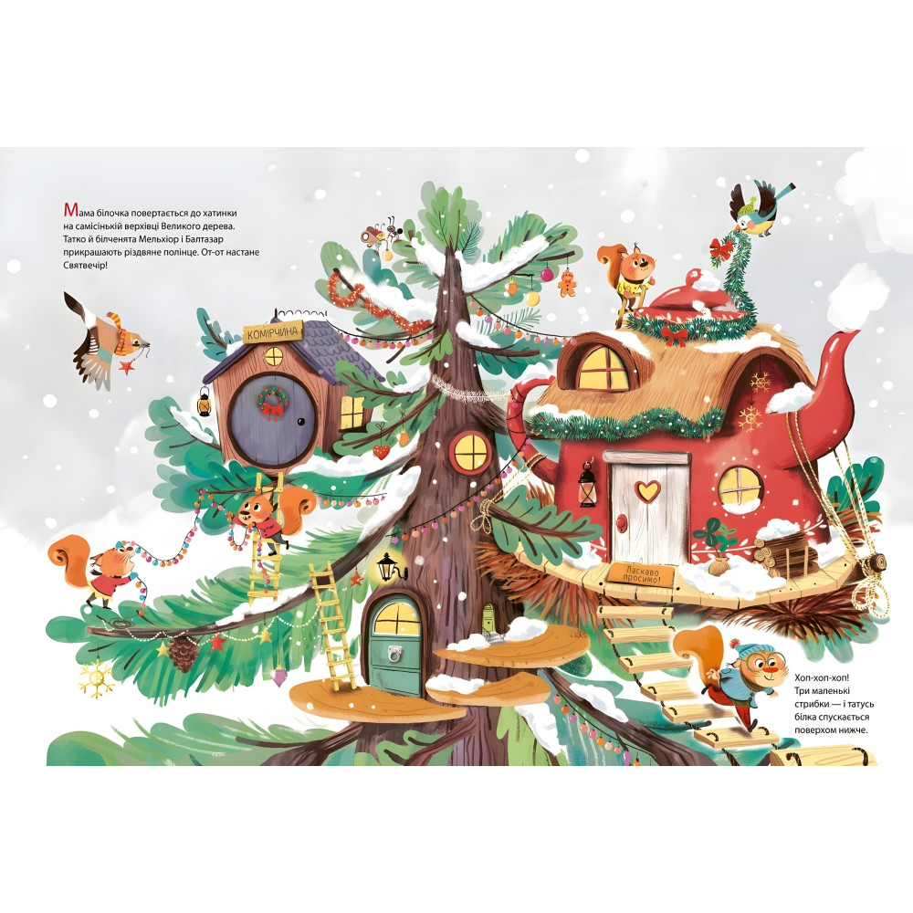 На вершине Великого дерева живет родина белок – папа, мама и трое бельчат – Мельхиор, Бальтазар и Каспар (такие имена малые волхвы, которые принесли Иисусу дары на Рождество). Накануне величественного праздника малыш Каспар бросился куда-то, и отец отправляется на поиски. Вместе с ним маленькие читатели будут прыгать с ветки на ветку, будут искать зверюшек и птенцов, разворачивать яркие окошки с сюрпризами, чтобы наконец узнать, где спрятался белченок и его друзья, и как готовятся к Рождеству в этом волшебном лесу.