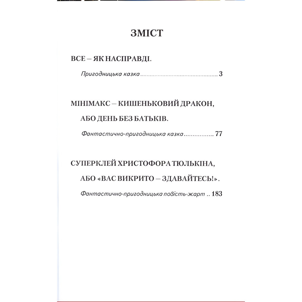 В книгу вошли три сказочных повести «Все – как на самом деле», «Минимакс – карманный дракон» и «Суперклей Христофора Тюлькина». Каждая из этих сказок приключенческая и полна здорового юмора. Герой первой повести «Все – как на самом деле» – третьеклассник Сергей Кудлик, проживающий с бабушкой, потому что его родители сейчас находятся на Кубе. Это обычный ребенок со своими типичными отношениями со школьниками и проблемами с некоторыми предметами. Например, у Сергея проблемы с физкультурой: он не умеет плавать, но очень хочет научиться. Кроме него, в книге еще двое детей – Олег Пчилка и Виктория Птурская. Но на День рождения с Сергеем случается совершенно удивительная вещь: под его кроватью появляется маленький старичок-домовик по имени Дима. И видеть его может только тот, кто любит сказки, а кто постоянно во всем сомневается, никогда не увидит это странное создание, не признающее, что является домовичком, и стремится к тому, чтобы его называли только по имени. А еще он может исчезнуть навсегда для того, кто ему не верит. Во многом этот дом напомнил мне подобного героя из книги Марины Павленко, написанной позже этой повести, потому что функционально оба домовичка занимаются воспитанием детей, развлекая их, рассказывая всяческие небылицы. Сходство прослеживается даже в некоторых деталях. Например, оба домовичка пишут мемуары, оба могут колдовать, но это стихотворное колдовство очень неуверенно и часто не действует так, как надо. Оба хвастаются, а Дима даже пишет о своей незаурядной роли в судьбе Робинзона Крузо и открытии силы земного тяготения Исааком Ньютоном.