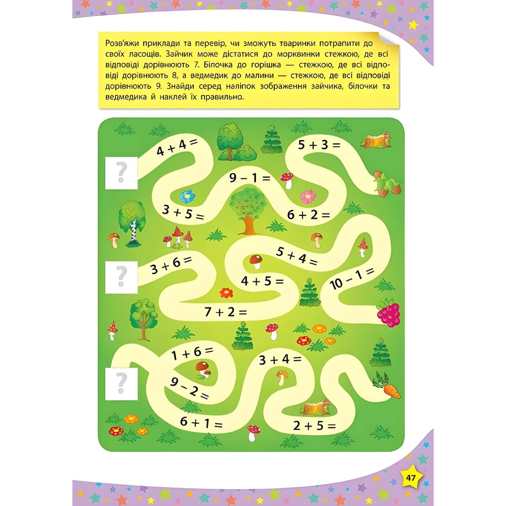 С этой книгой ваш ребенок научится писать печатные буквы украинского алфавита, рисовать разные типы линий, фигуры, орнаменты и предметы по пунктиру и ячейкам. Малыш сможет вспомнить числа от 1 до 10 и основные геометрические фигуры, научиться измерять длину предметов с помощью линейки, сравнивать предметы и числа решений и связывать простые примеры и задачи. Задания в книге предусматривают работу с наклейками, что непременно понравится ребенку. Издание предназначено для совместной работы детей от четырех лет с родителями.
