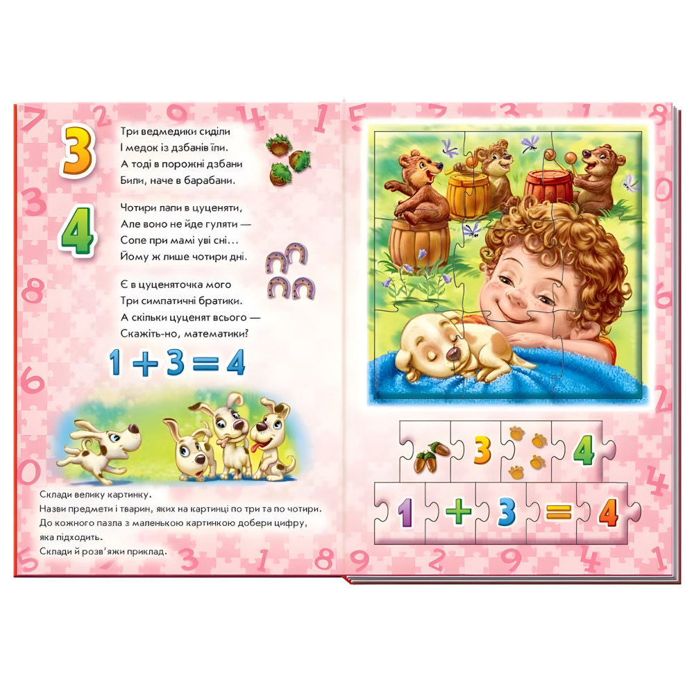 Эта большая книга пазлов – лучший подарок ребенку, который только учится считать. Играя с ним, ребенок может: • слушать стихи; • складывать большие картинки-пазлы; • подбирать цифру к картинке и картинку к цифре; • составлять примеры и решать их!