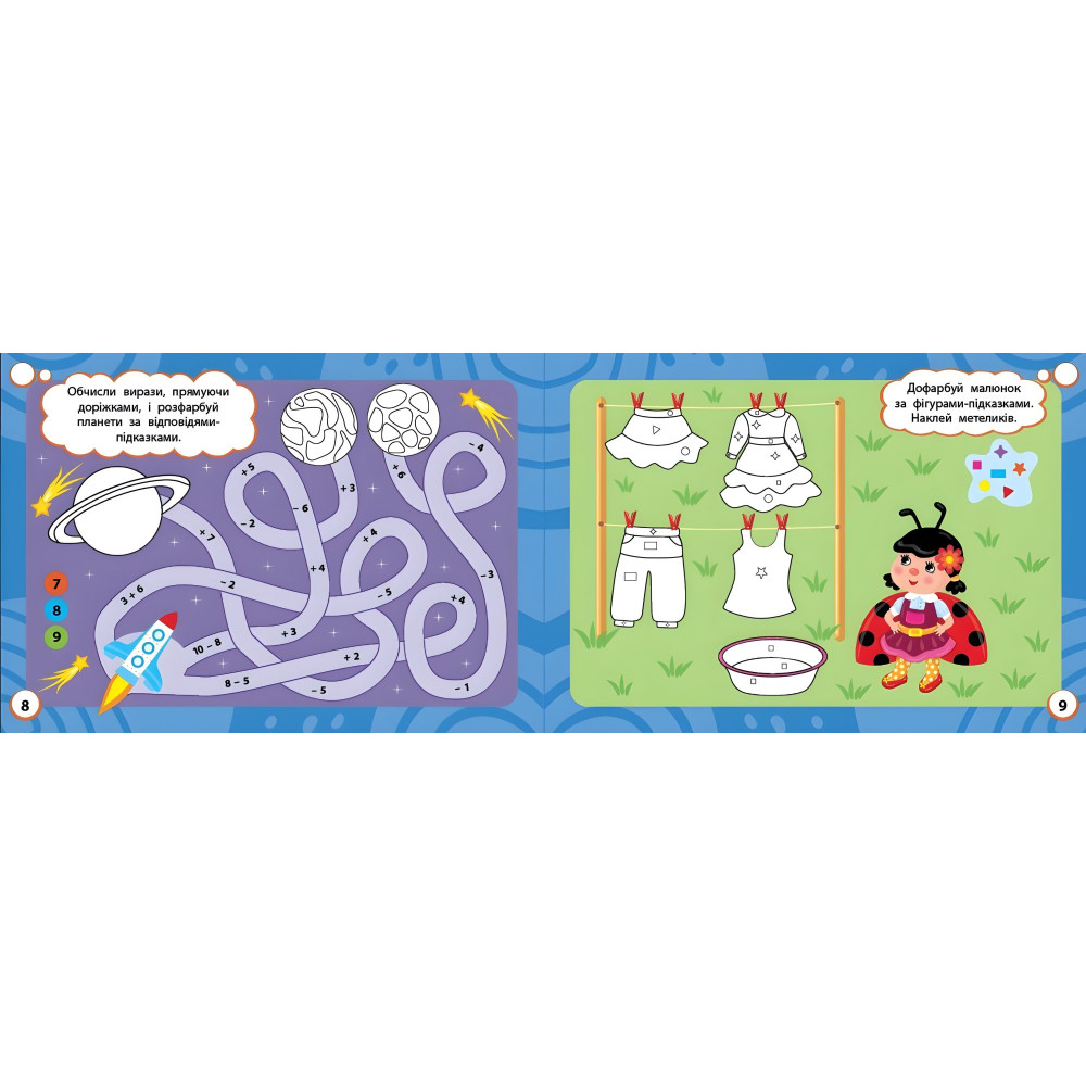 С книгой «Учебные раскраски» ребенок интересно и с пользой проведет время, ведь будет раскрашивать рисунки по разным подсказкам — цифрам, фигурам, цветам, изображениям, образцам, ответам к выражениям. Вместе с тем малыш потренируется наводить по пунктиру и творчески дополнять рисунки наклейками. Работа с изданием поможет улучшить мелкую моторику пальцев рук, разовьет внимание и воображение, потренирует память и усидчивость, воспитает усердие и аккуратность во время выполнения заданий. Издание предназначено для детей дошкольного возраста и их родителей