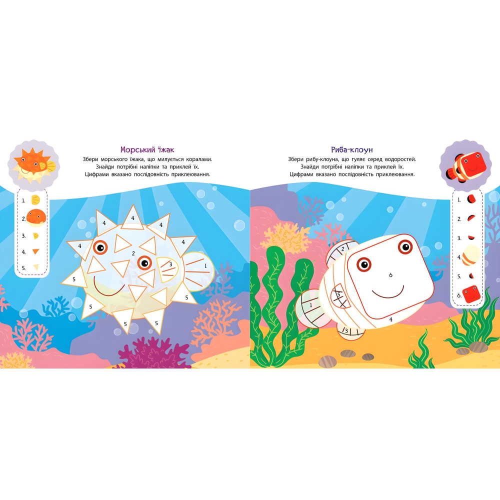 Издание содержит подробные наглядные схемы и наклейки разных геометрических форм и цветов. Следует ребенку внимательно поработать – и они превратятся в ярких морских жителей. Кроме конструкторов из наклеек, в книге маленького умника ждет 3D модель краба, вырезав и склеив которую получит объемную бумажную игрушку. Издание не только разнообразит детский досуг, но и поможет развить воображение и логику, мелкую моторику и пространственное мышление малыша, а также изучить формы и цвета.