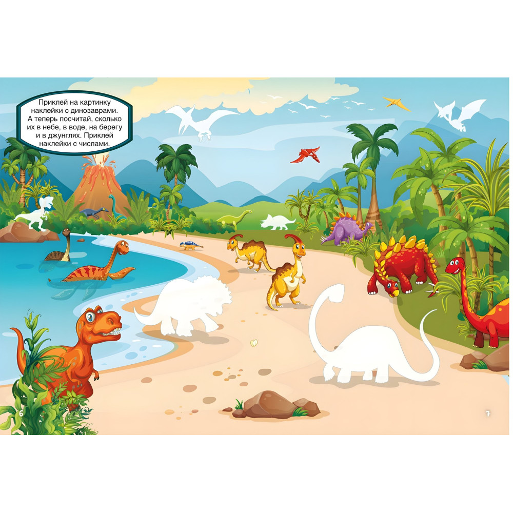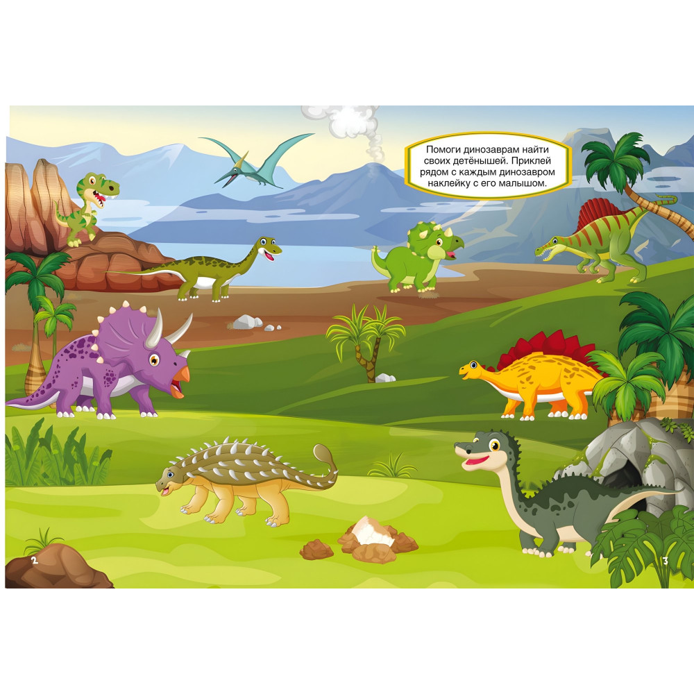 Скорее заходи в нашу книгу, чтобы познакомиться с забавными динозавриками. Ты сможешь узнать много интересного, если правильно выполнишь все предложенные задачи. А помогут тебе в этом 55 красочных развивающих наклеек. Используй в качестве подсказки указанные рядом с ними номера страниц.