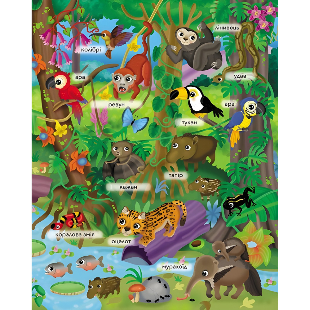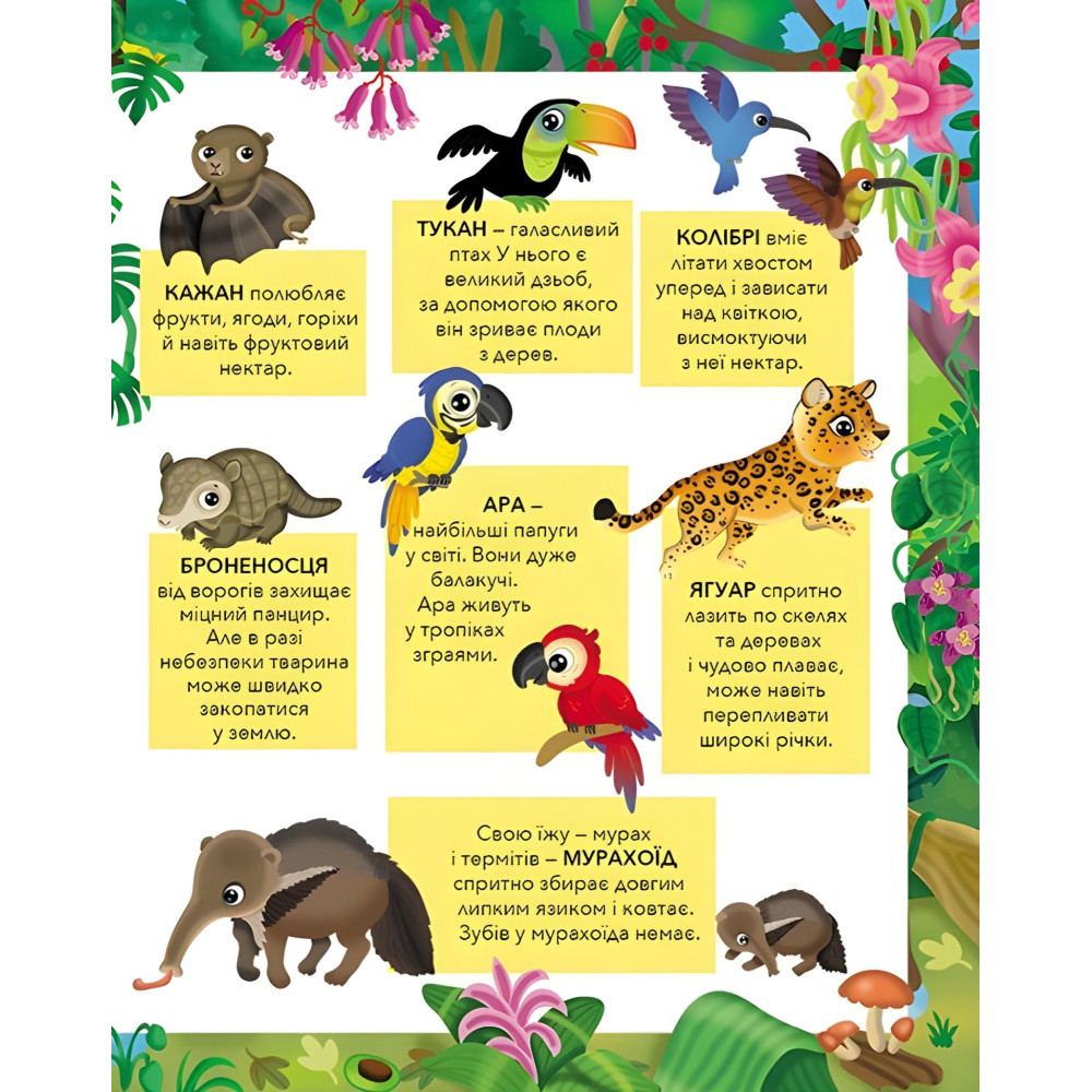 Ну, как может быть страшно, когда смотришь на такие доверчивые глаза ленивца! Который к тому же двигается ужасно медленно, а большую часть дня спит. Ну настоящий ленивец! Или, скажем, на броненосца. Да он сам от страха зарыется в землю — не успеешь и глазом моргнуть! А это кто? Какое-то удивительное существо, да еще с хоботом! Может, маленький слоник? Да нет! Это же муравьед. Дети его ничуть не интересуют – только муравьи. К тому же у него есть одна тайна, которую он скрывает от всех. Но... только не от читателей книги наклеек «Джунгли». Что это за тайна? Пусть малыши сами отыщут ее в этой книге — в кратких описаниях характерных особенностей тропических животных.