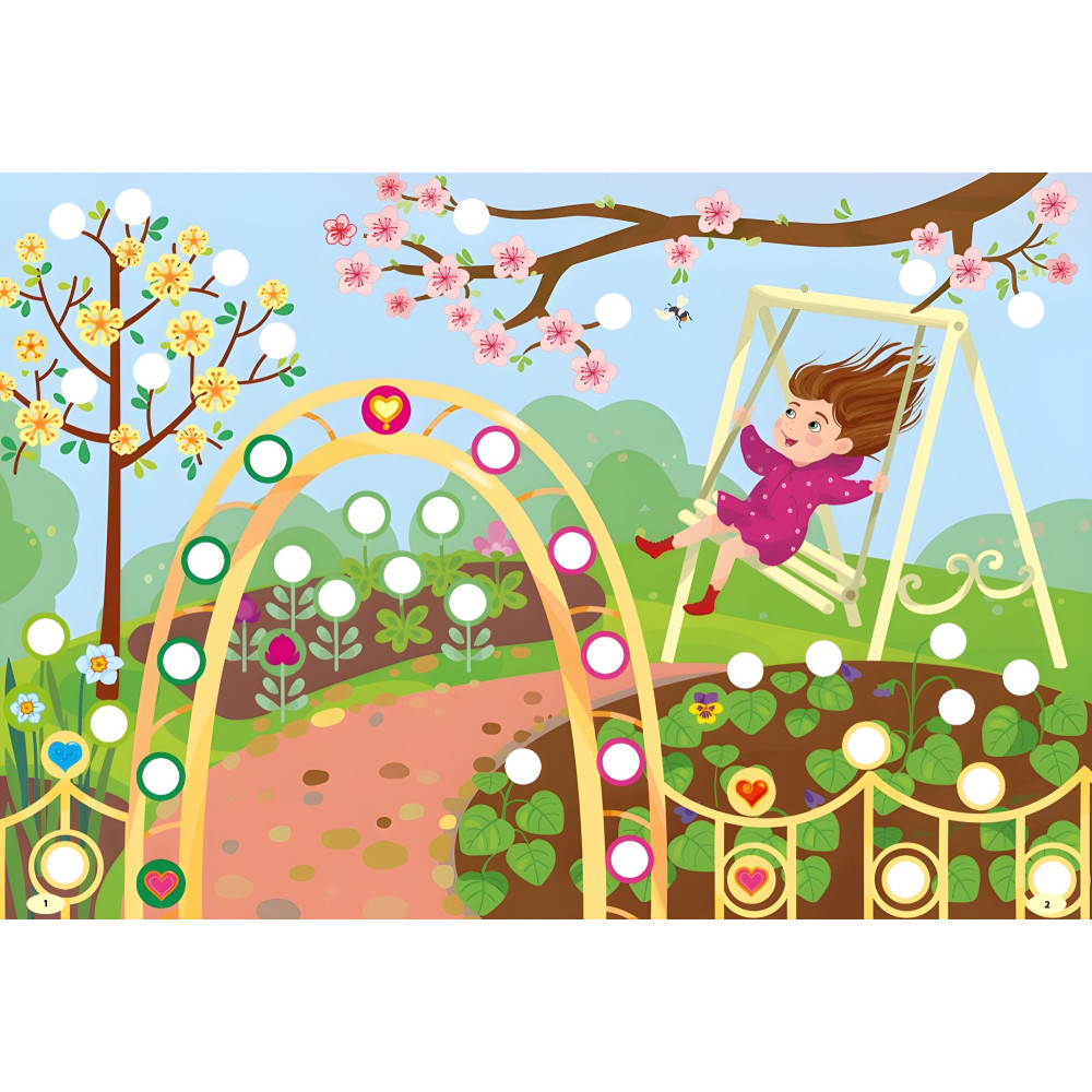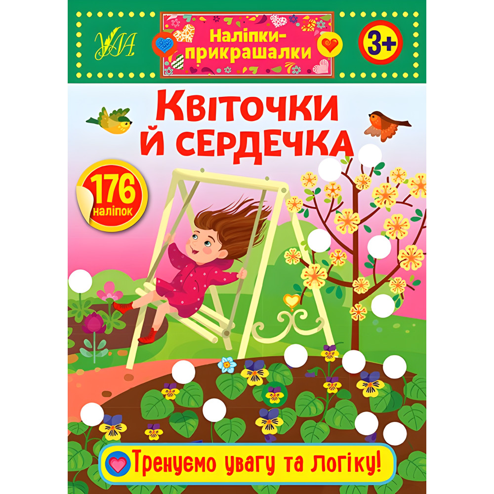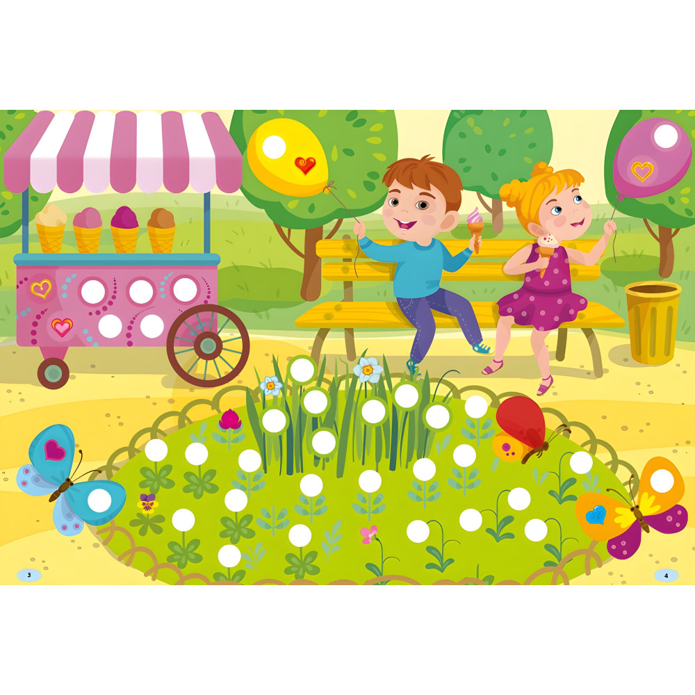 Издание содержит 176 наклеек – разноцветных цветочков и сердечек. Ребёнок должен дополнить с их помощью картинки: вклеить их в пустые кружочки по образцу. Цвет контура наклеек служит малышу подсказкой. Работа с этой книгой будет способствовать развитию у ребенка внимания и логики, мелкой моторики и координации движений руки, аккуратности и творческого мышления.