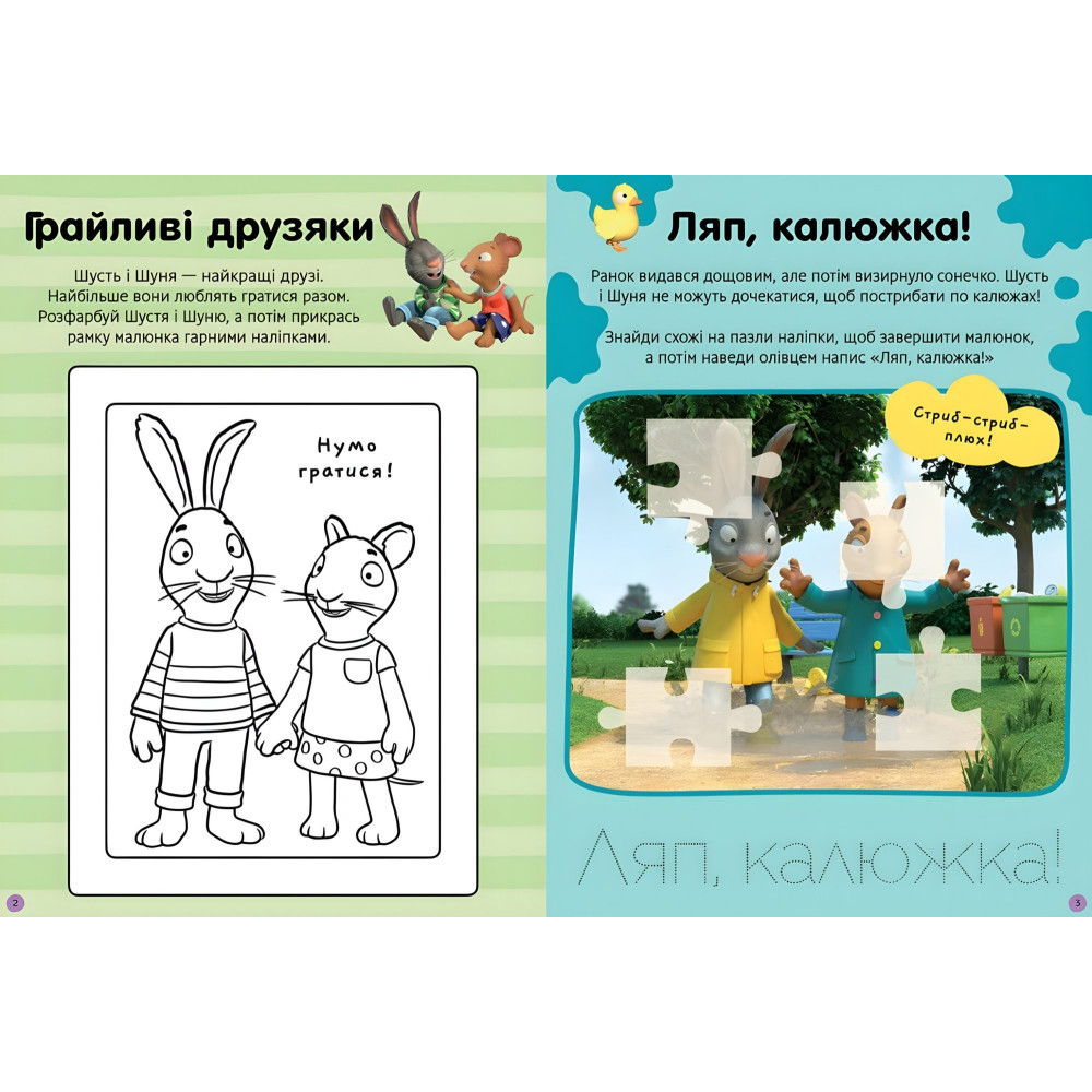 Стикербук с заданиями по мотивам мультсериала о Шусте и Шуне! Шусть и Шуня обожают играть! Разворачивай этот стикербук и присоединяйся к ним. Взяв цветные карандаши и наклейки, ты сможешь поиграть с пушистыми друзьями — лучше их не представлять! Здесь тебя ждут загадки, расцветки и целая купа стикеров. Почему стоит приобрести: · Первый стикербук с любимцами малышей – Шустем и Шуней! · Книга содержит более 20 разнообразных задач — малыш будет клеить наклейки, разрисовывать, искать отличия, проходить лабиринт, создаст свой значок участника тайного клуба и многое другое! Интересный факт: · Шусть и Шуня – герои целой серии бестселлеров. В Англии их зовут Pip and Posy. В серию входят не только краткие рассказы, но и книга с заданиями «Найди и назови».