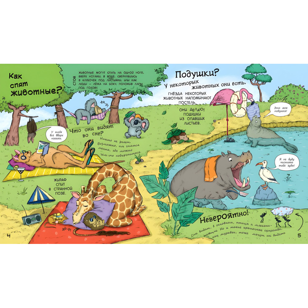 Книга «В гостях у животных. Как животные спят» рассказывает детям о том, как спят разные животные в природе: кто дремлет стоя, кто спит с открытыми глазами, а кто может крепко спать даже во время движения. Яркие иллюстрации и интересные факты делают чтение увлекательным и познавательным. Издание на русском языке подходит для дошкольников и младших школьников, помогает расширить знания о мире природы и развивает интерес к животному миру.