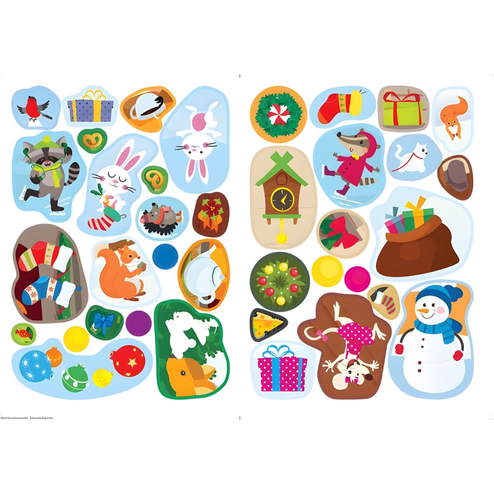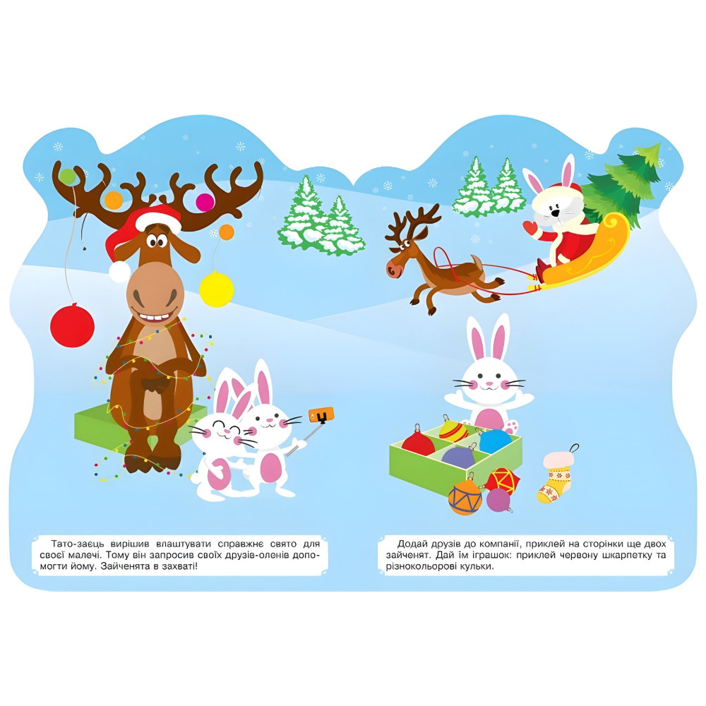 В лес пришла зима-волшебница. Продолжаются праздничные приготовления: зверьки украшают елки и домики. Давайте вместе с ними готовиться к празднику! А помогут нам в этом красочные наклейки! Они дополнят картинку и сделают ее ярче и красивее. Книга создана для организации веселого отдыха родителей с малышами. Задания с наклейками направлены на развитие фантазии, воображения и мелкой моторики.