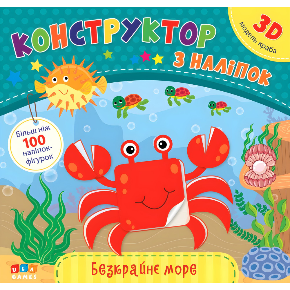 Издание содержит подробные наглядные схемы и наклейки разных геометрических форм и цветов. Следует ребенку внимательно поработать – и они превратятся в ярких морских жителей. Кроме конструкторов из наклеек, в книге маленького умника ждет 3D модель краба, вырезав и склеив которую получит объемную бумажную игрушку. Издание не только разнообразит детский досуг, но и поможет развить воображение и логику, мелкую моторику и пространственное мышление малыша, а также изучить формы и цвета.