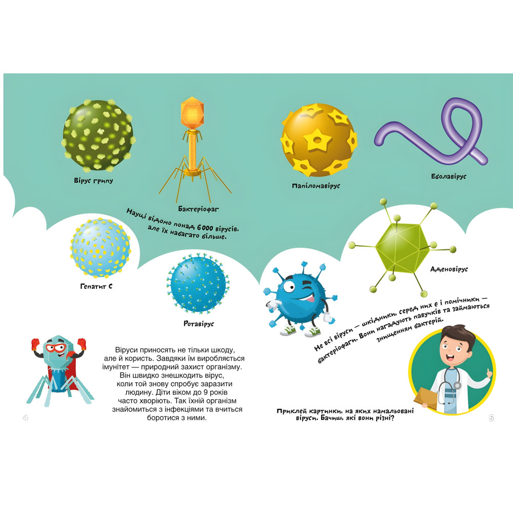 Скорее загляни в нашу книгу, чтобы узнать, что такое вирусы. Мы расскажем, как защититься от этих крошечных нападающих, и предложим выполнить интересные задачи. Справиться с ними помогут 42 красочные развивающие наклейки. За подсказку тебе будут давать указанные рядом с ними номера страниц.