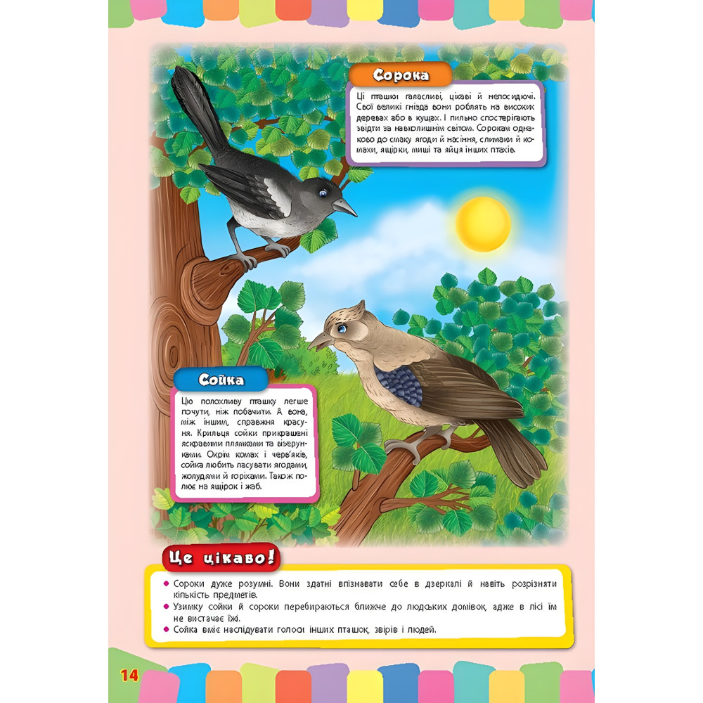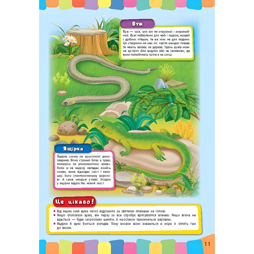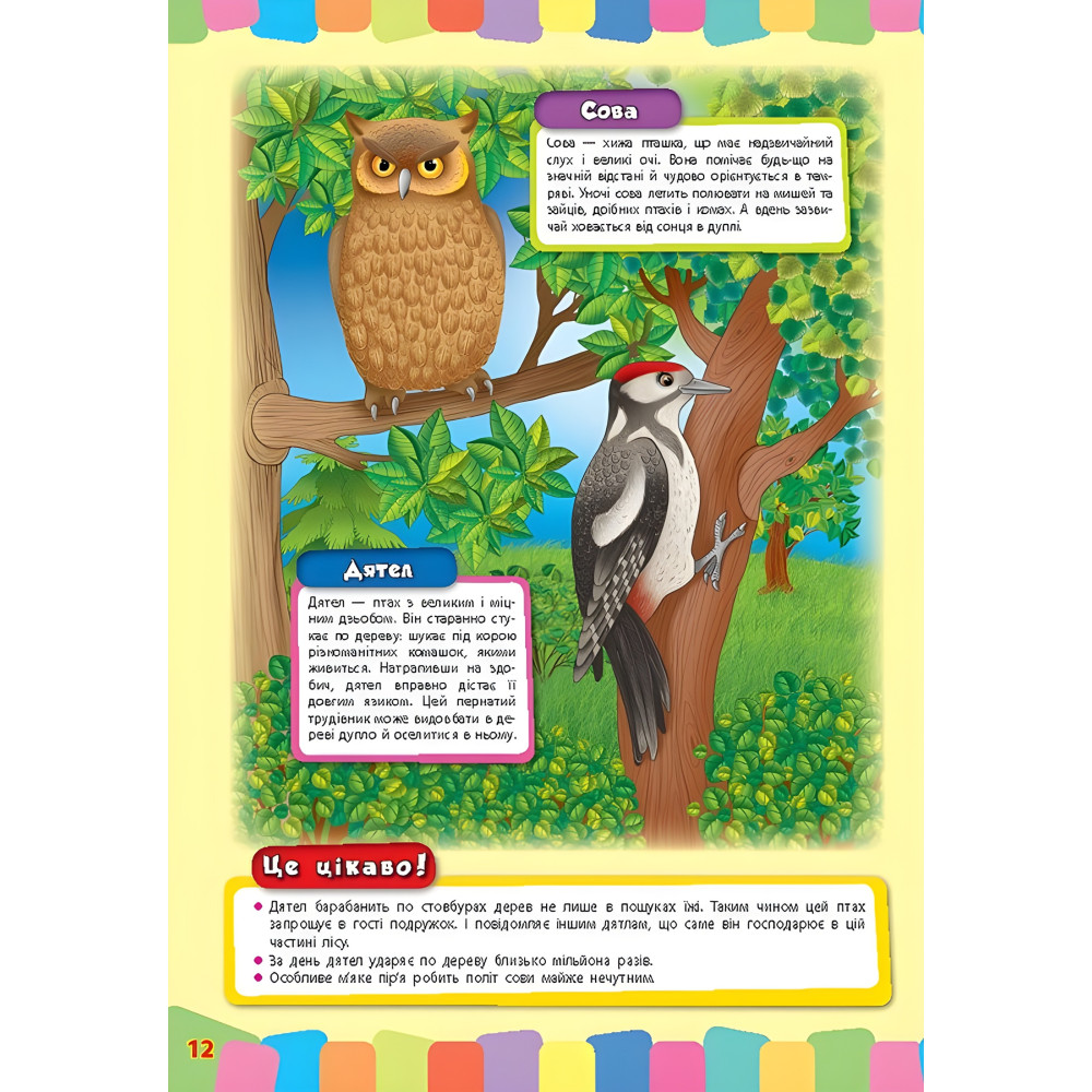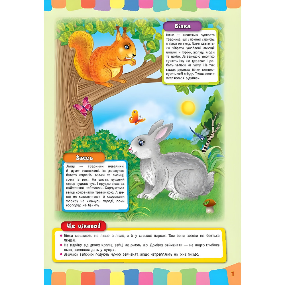 Книга рассказывает о диких зверях, птицах, насекомых, пресмыкающихся и других представителях украинской фауны. Каждая страница содержит яркую иллюстрацию с изображением сразу двух животных. Рисунки сопровождаются сведениями о привычках лесных обитателей, их потребностях в еде и особенностях поведения, а также интересными фактами из их жизни. Представленный иллюстративный материал позволяет выбрать для изучения именно такой объем информации, который соответствует возрасту и уровню развития вашего ребенка.