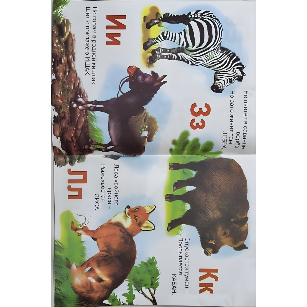 Очень яркая книга – на каждую букву алфавита есть веселое двустишие Ст. Степанова. Стихи написаны большим шрифтом, а сами буквы прописны и выделены красным цветом. В каждом развороте помещается 4 буквы, а у каждой буквы – красочные картинки (очень детские, но достаточно реалистичные изображения животных).