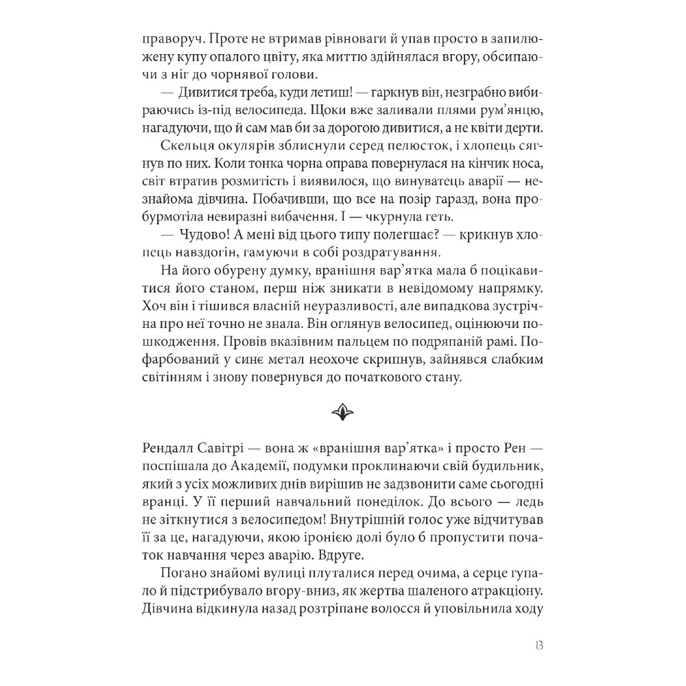 Рендалл відверто не щастить: її життя летить шкереберть, а сама вона опиняється в химерній Академії Аматерасу, куди приходять душі гордих богів, перероджуючись у нескінченному русі Колеса Долі. Тут могутні сили дрімають до першої години,коли озвуться на поклик Слів, а нові знайомі приховують таємниці, яких небезпечно торкатися. Та шляху назад для Рен немає, бо вона мусить відшукати відповідь на питання, яке дзвенить у голові: «Хто ти, Рендалл Савітрі?»Це історія про те, що найзапекліші битви — завжди з собою, найважливіші подорожі — у глибини власної душі, а любов і дружба варті того, щоб виходити за межі своїх можливостей, стіни законів та навіть за грань життя і смерті. Адже не треба бути могутнім богом, щоб бути людиною.