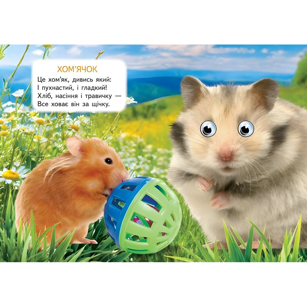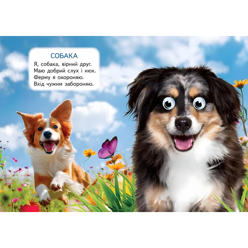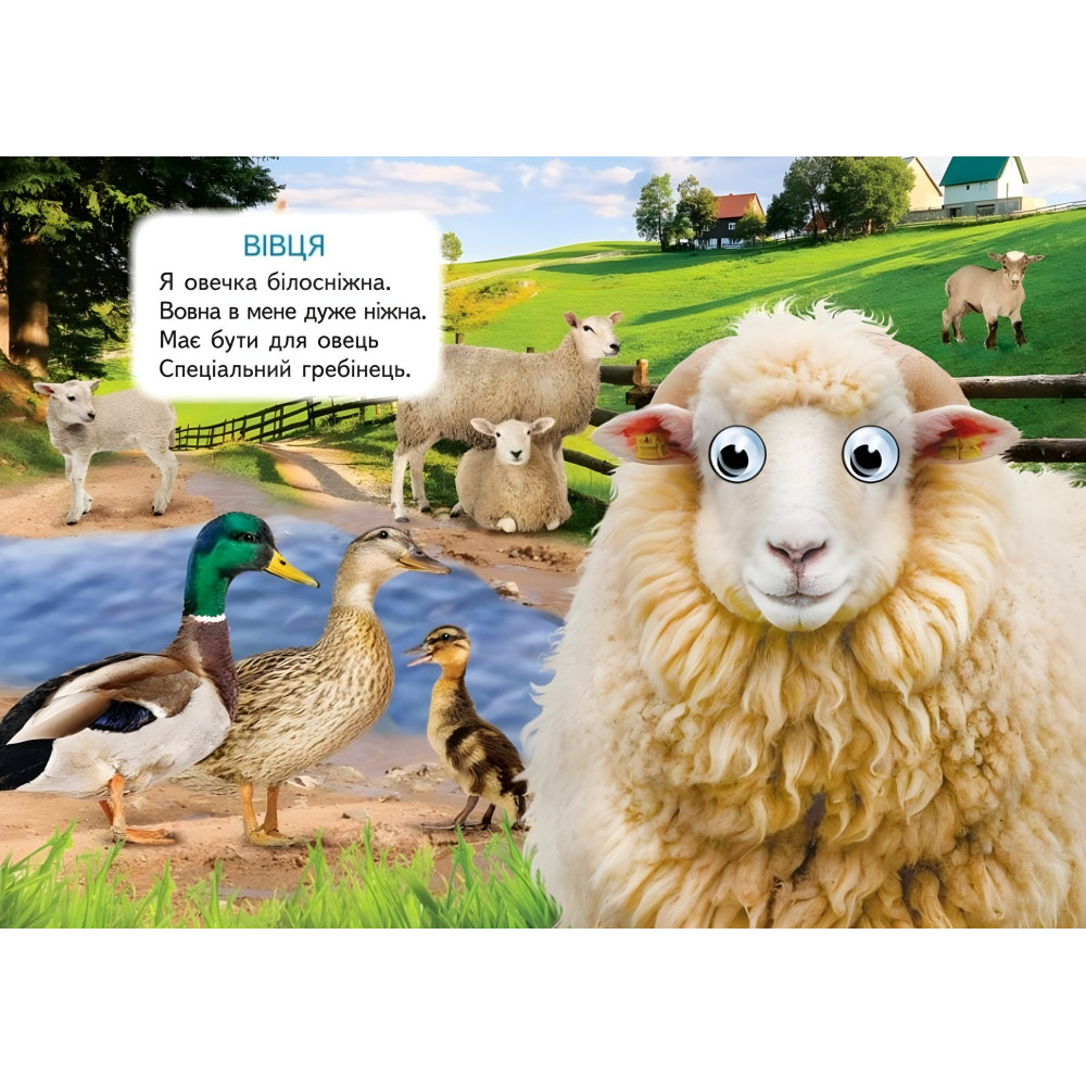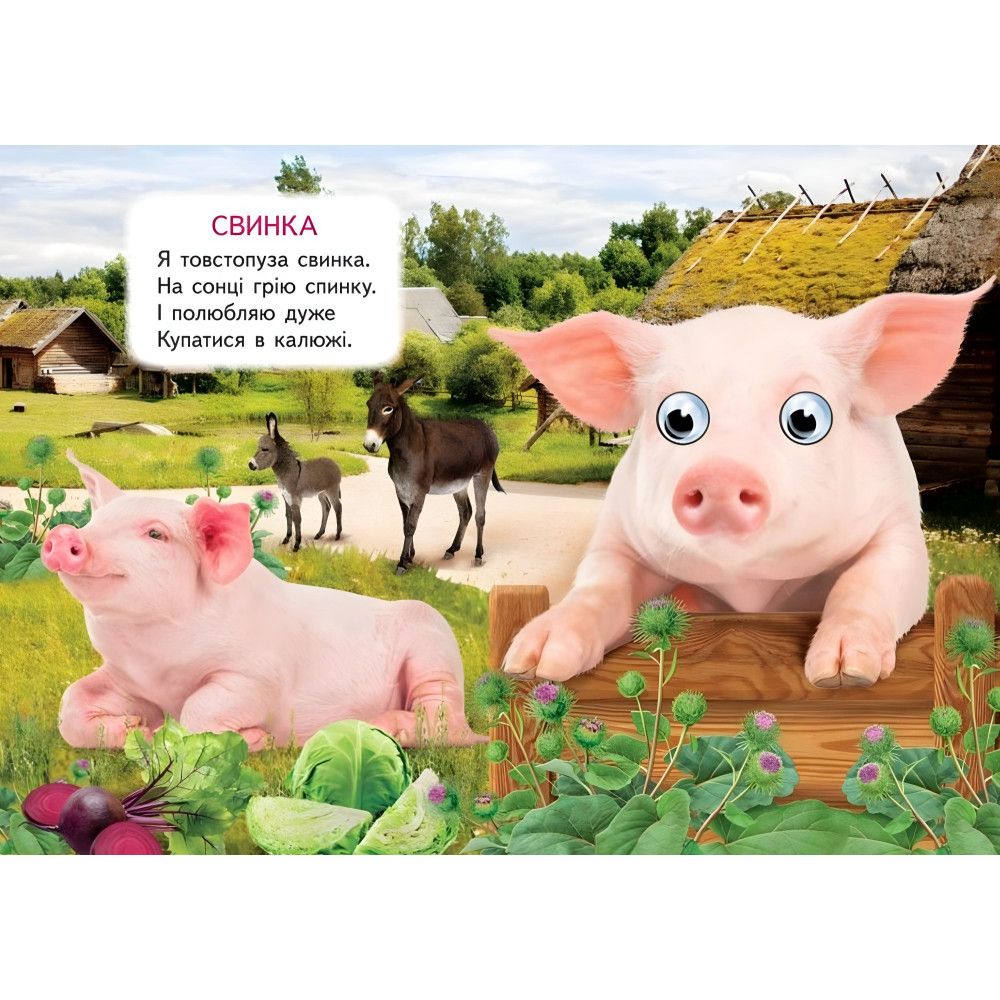 «Ферма» - це яскрава картонна книжка з рухомими оченятами, яка познайомить малюка з мешканцями сільського подвір’я: коровами, свинками, курочками, гусками та іншими веселими друзями. Щільні сторінки з милими ілюстраціями, простими текстами та кумедними очима перетворюють читання на справжню пригоду. Книжка стимулює зорове сприйняття, мовлення, моторику та любов до природи