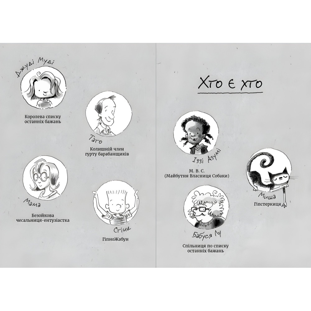 Усі знають, що Джуді Муді — королева списків! Але такого списку, як у бабусі Лу, вона ще не мала — списку останніх бажань, які варто здійснити, поки не зіграєш у ящик! Надихнувшись, Джуді береться складати власний список того, що хоче втілити до четвертого класу: прокрутити колесо, покататися на коні, побувати у справжній Антарктиді й не тільки... Та чи встигне вона це здійснити і що буде, коли бабуся Лу виконає все заплановане зі свого списку?.. Читайте у нових пригодах невгамовної Джуді!