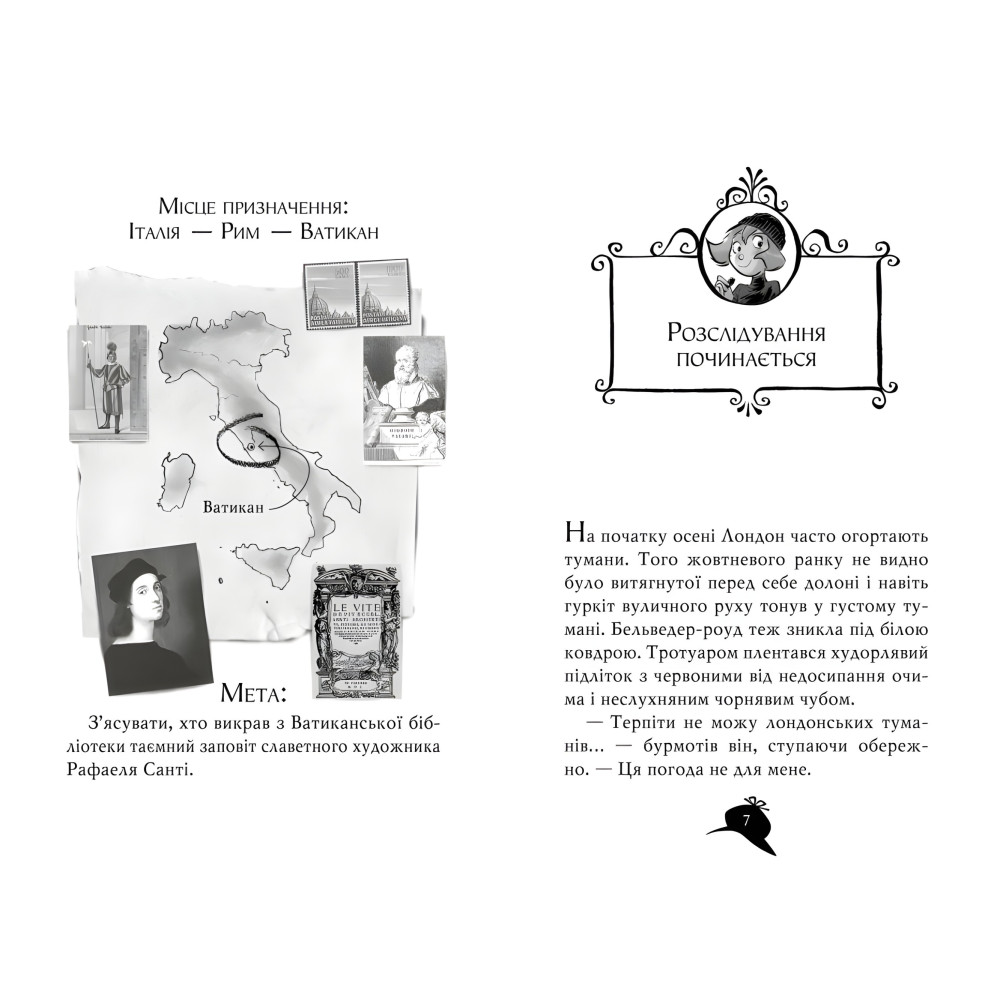 Наділена дивовижним відчуттям і феноменальною пам’яттю, Агата Містері мріє стати письменницею, але це в майбутньому. Поки що вона — чудовий детектив! Разом із простакуватим кузеном Ларрі, студентом школи детективів, вона подорожує світом, розгадуючи найзаплутаніші таємниці. Допомагають їм відданий мажордом, капосний сибірський кіт і сила-силенна дивакуватих родичів. Крадіжка у Ватикані Із Секретного архіву Ватикану викрадено щойно виявлений заповіт Рафаеля, знаменитого італійського художника XVI ст. Агата і Ларрі Містері негайно вирушають до Італії. На щастя, у Римі живе їхній дядько Алджернон — учений-палеограф. Разом їм доведеться відшукати зниклого листа та ще й здійснити сенсаційне відкриття…