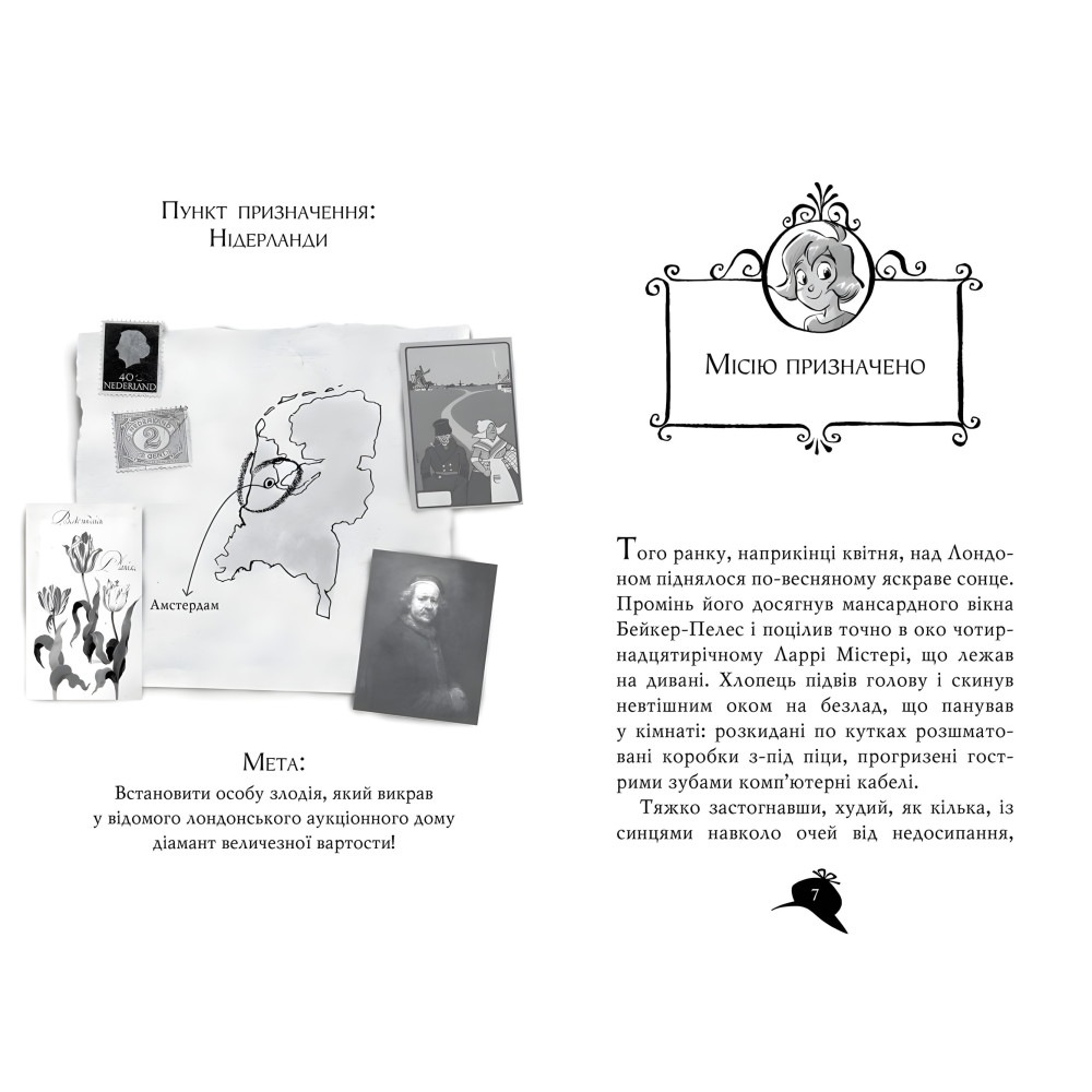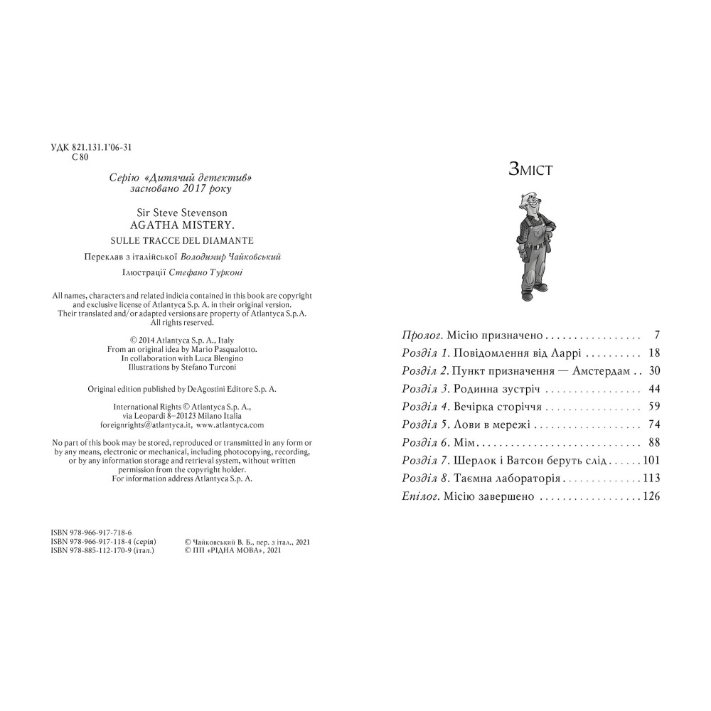 Наділена дивовижним чуттям і феноменальною пам’яттю, Агата Містері мріє стати письменницею, але це в майбутньому. Поки що вона — чудовий детектив! Разом із простакуватим кузеном Ларрі, студентом школи детективів, Агата подорожує світом, розгадуючи найзаплутаніші таємниці. Допомагають їм відданий мажордом, капосний сибірський кіт і сила-силенна дивакуватих родичів.Слідами діамантаЗдається, Ларрі закохався. Він навіть завів собаку, щоб познайомитися із прекрасною власницею пуделихи. Однак у найвідповідальніший момент хлопця викликали для розслідування таємничої крадіжки діаманта. Та хіба ж ладен Ларрі впоратися із завданням без кузини Агати? Тож уся компанія — Ларрі, Агата, мажордом, сибірський кіт Ватсон і біґль Шерлок — терміново вирушає до Амстердама на пошуки зниклого самоцвіту.