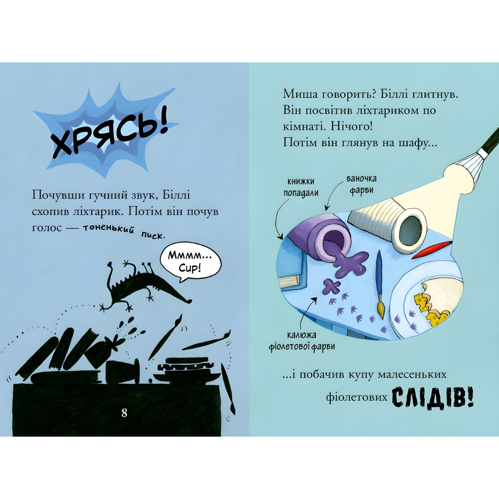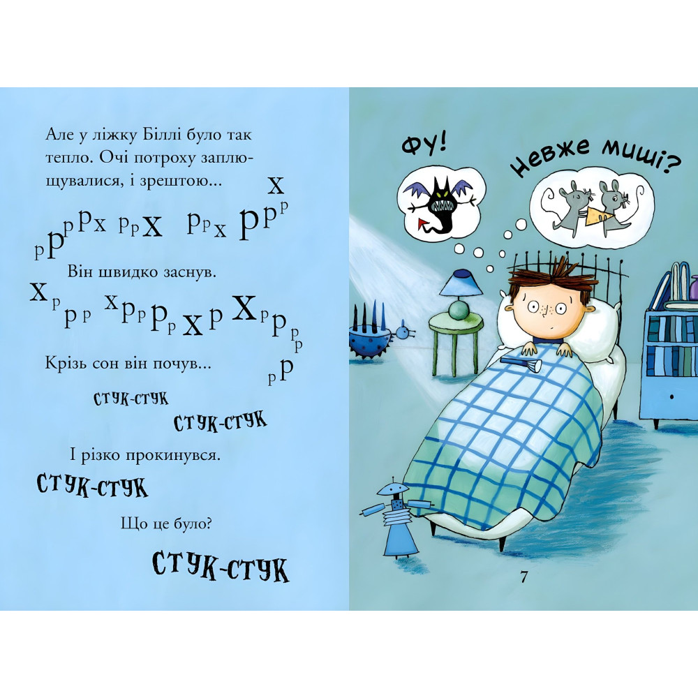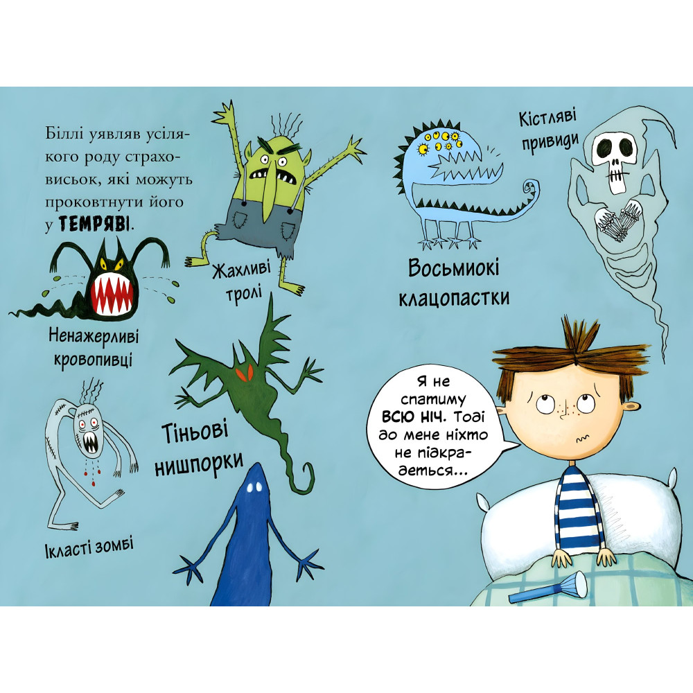 Біллі вирішує: треба не спати вночі, і тоді моторошні монстри до нього не прийдуть. Аж раптом він чує який тихий писклявий голос, а тоді помічає дивні фіолетові сліди. А ще хтось напав на його бутерброд! І в шафі пахнуть зовсім не його шкарпетки… Смішна історія для найменших читачів, що допоможе боротися із дитячими страхами. Бо всім відомо: найкраща зброя проти страху – це сміх!