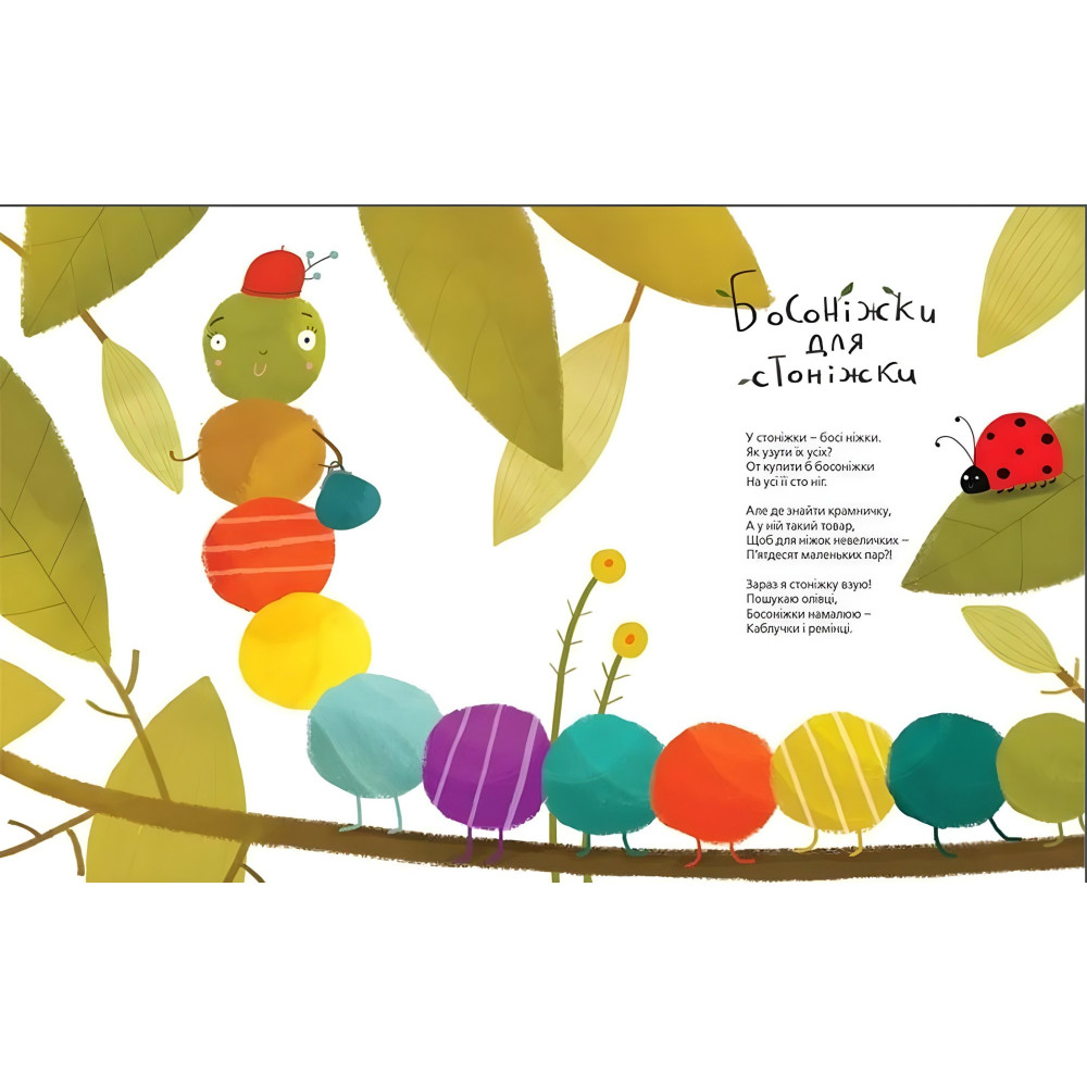 «Босоніжки для стоніжки» – нова книга чудових віршів для дітей відомої поетеси і «мами» ВСЛ Мар’яни Савки.Добрі і веселі віршики про стоніжку, для якої потрібно купити півсотні пар взуття, про Мишку, яка, мріючи про нове хутерко, затягнула до своєї нірки… котячий хвіст, про Корову, яка навіть уміє вишивати, про маленького Равлика, про кота, акулу і лиса та багатьох інших звірят, яких намалювала художниця Юлія Пилипчатіна.«Босоніжки для стоніжки» мають ще одну «родзинку»: художниця залишила читачам простір для співтворчості, отож вони зможуть розмалювати і взуття для стоніжки, і листя на дереві й веселих мишенят.