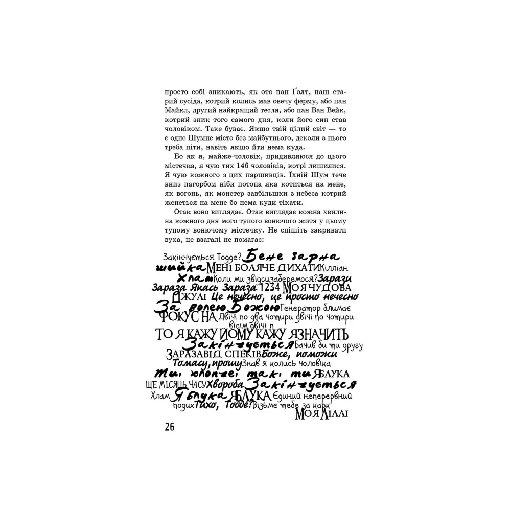 Світовий бестселер. Незабаром на кіноекранах!Тодд Г’юїтт — єдиний хлопчик у Прентісстауні, де живуть лише чоловіки. За місяць йому виповниться тринадцять і, за місцевими законами, він теж стане справжнім чоловіком. Усі прентісстаунці з нетерпінням чекають на його день народження. Тодд знає про це, бо чує думки інших, а вони чують його. Загадковий вірус Шуму багато років тому заразив чоловіків та тварин Прентісстауна і знищив усіх жінок. Принаймні так завжди казали Тодду дорослі й так вважав він сам, поки не зустрів її — страхітливу, всепоглинаючу, цілковиту тішу... І тепер, щоби уникнути долі, приготованої йому Прентісстауном, хлопець мусить тікати у світ, якого не мало існувати, з людиною, якої не мало бути...