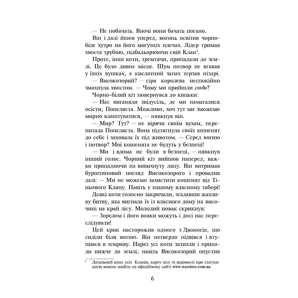 СВІТОВИЙ БЕСТСЕЛЕР Друга книга серії світового бестселера «Коти-вояки». Продовження історії хатнього котика Рудька. Він залишив тепле і затишне життя домашньої кицюні. Тепер він — Вогнесерд, вояк Громового Клану диких котів. Полювання у лісових хащах, запеклі бійки з ворогами, ночівля під зоряним небом і повна свобода, яку ніхто не обмежує… Про що ще можна мріяти? Та чомусь Вогнесерд все частіше згадує своє минуле. Там були любов, тепло, ласка, а зараз навколо нього — холодна байдужість, нерозуміння і навіть неприхована ненависть. Чи стане він врешті своїм для Клану, за який ладен віддати власне життя? Чотири Клани котів. Чотири потужні стихії. Чотири армії вояків, що живуть за законами честі та братерства. Приєднуйся до них, пригоди починаються! Переклад з англійської — Катерина Дудка, Остап Українець. Оформлення — Олег Панченко. При перекладі тексту українською для опису загального устрою котячих кланів та громадянства їхніх членів була використана термінологія Національної скаутської організації України «Пласт».