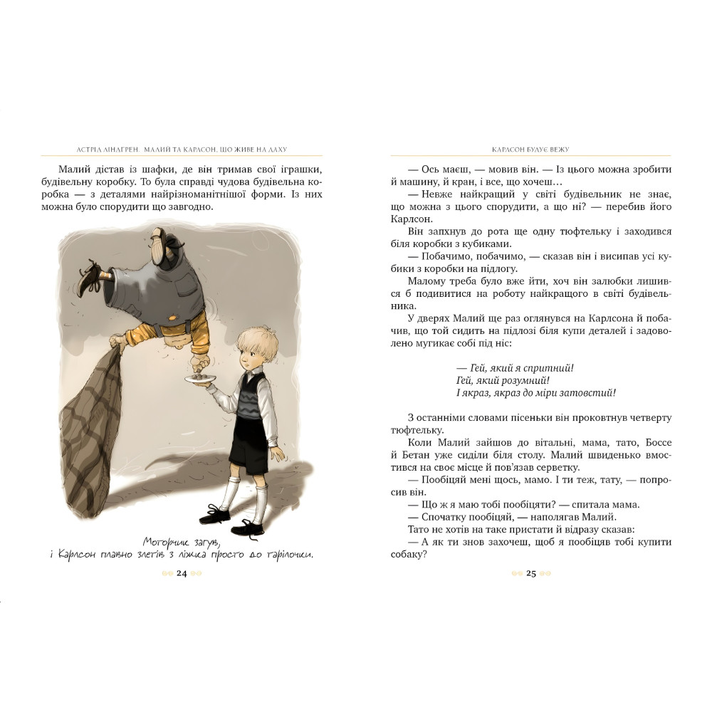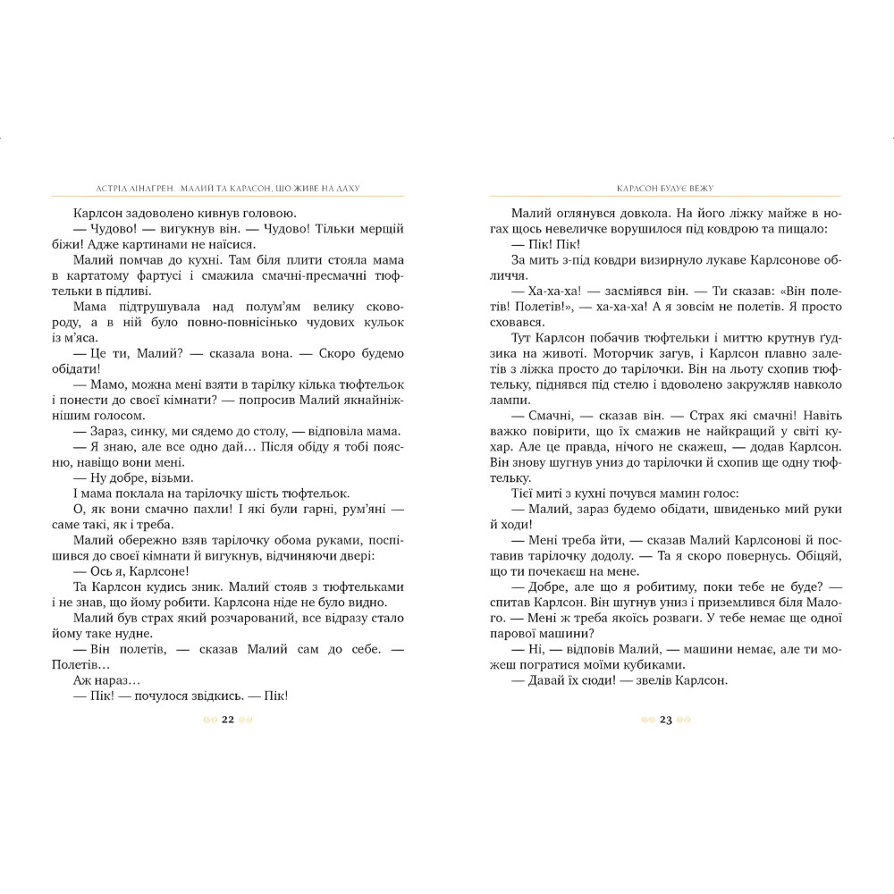 «У місті Стокгольмі…» — із цієї фрази розпочинається захоплива повість, яка полюбилася не лише дітям усього світу, а й їхнім батькам. Так от, живе в цьому північному місті, у звичайному будинку, звичайнісінький Малий, а на даху мешкає дивовижний веселун — Карлсон, який має моторчик на спині й уміє літати. Дружать Малий та Карлсон від 1955 р., коли було написано першу книжку. Юні читачі зануряться у фантастичний світ, аби на одному подиху прочитати про неймовірні пригоди завзятих героїв. Тож мерщій розгортай цю книжку, до якої доклали творчих зусиль і таланту перекладачка зі шведської Ольга Сенюк і художник Арсен Джанік’ян.