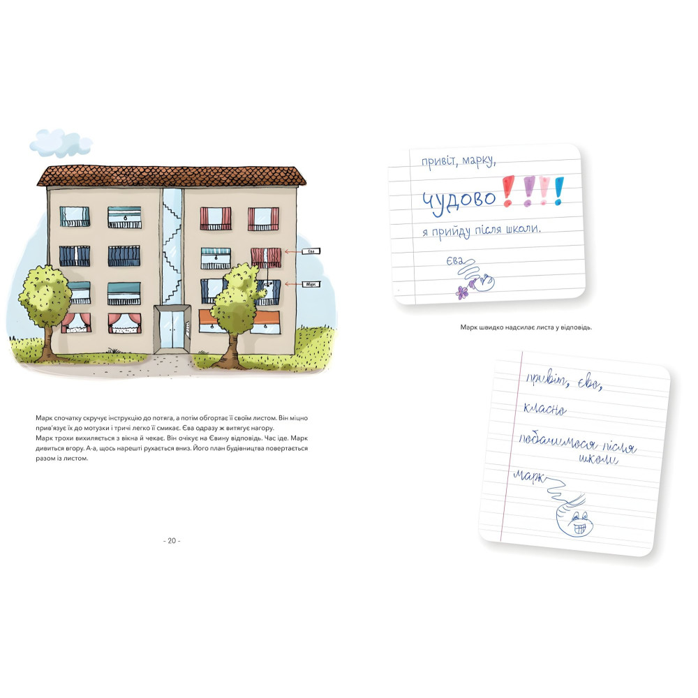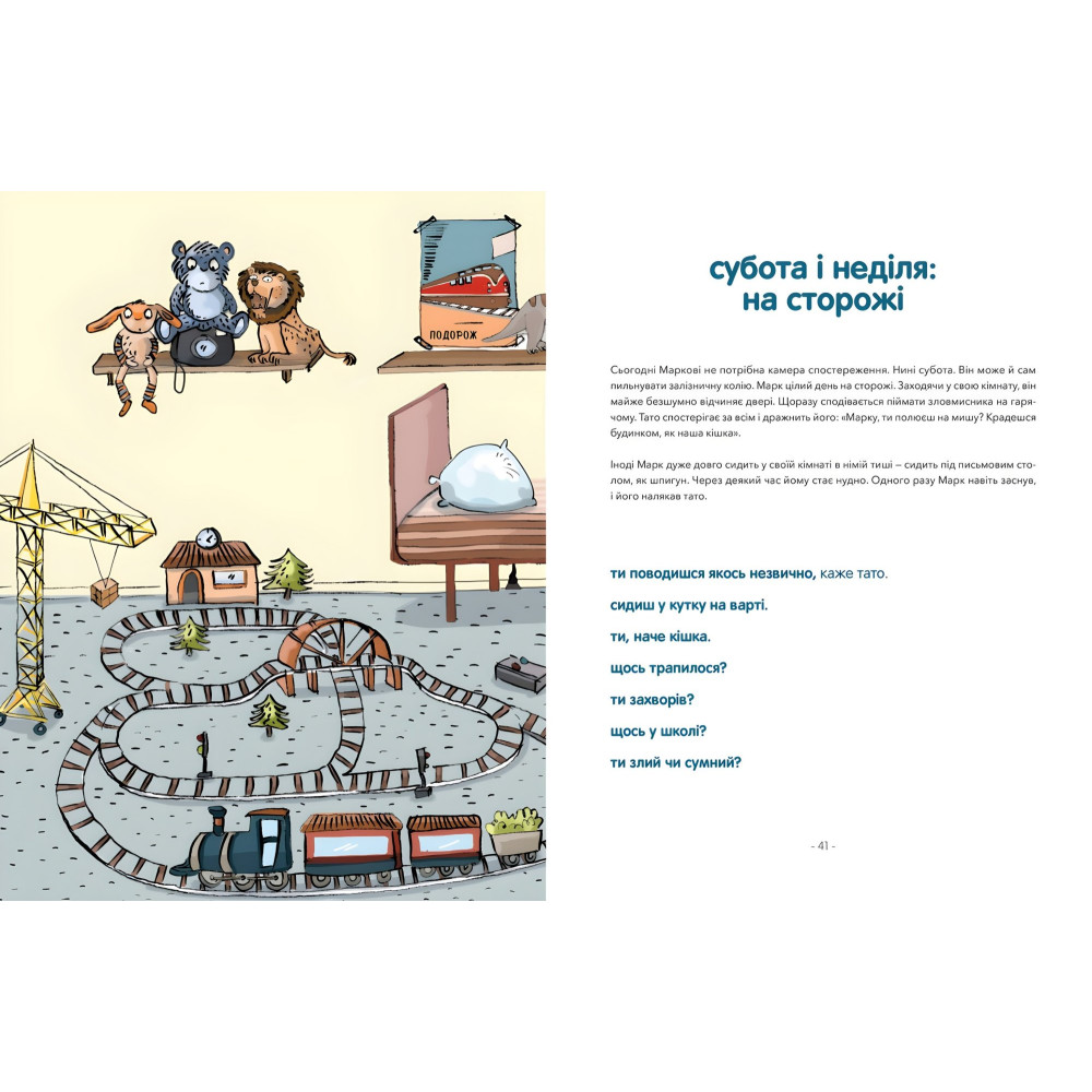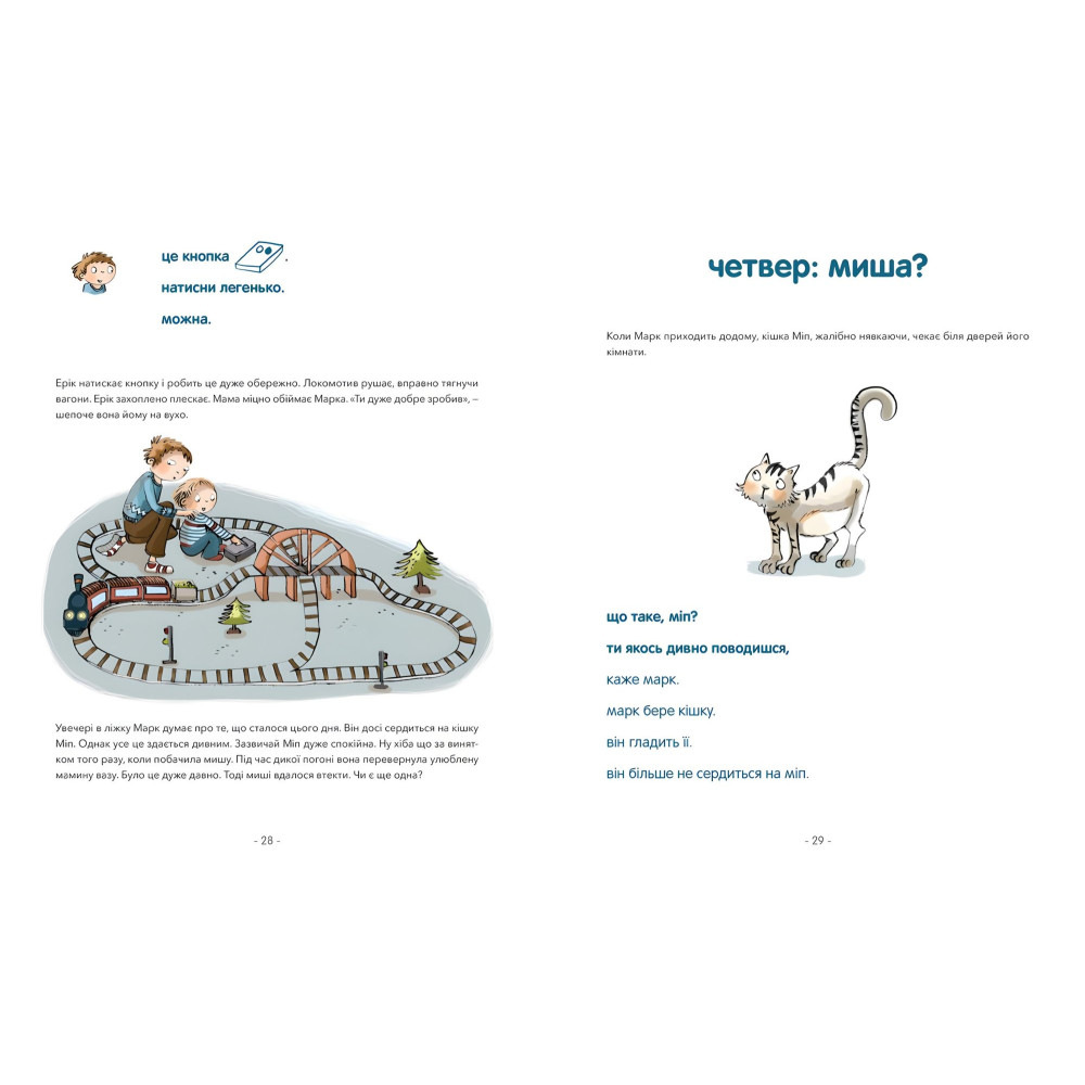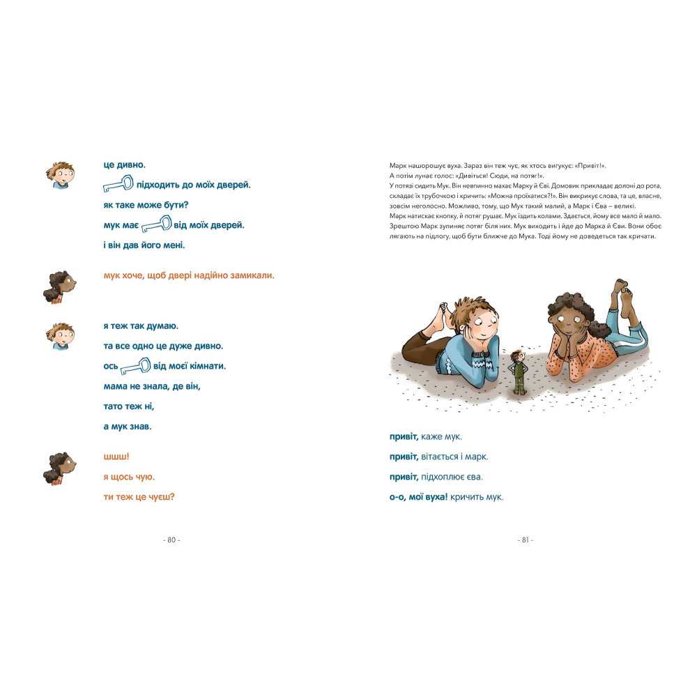 «Марк і Єва. Чудний потяг» — це книжка для спільного читання: великі літери для читача-початківця, а маленькі — для досвідченого читача. У ній поєднані задоволення та гордість від перших кроків до самостійного читання. Книжка містить поради та підказки щодо розвитку грамотності: рольові ігри, різні шрифти, рукописні букви та багато іншого. У кінці видання є розширений додаток, щоб адаптувати вашу роботу з книжкою до потреб дитини, а також дієві поради, як навчатися за допомогою гри. Насолоди від спільного читання!