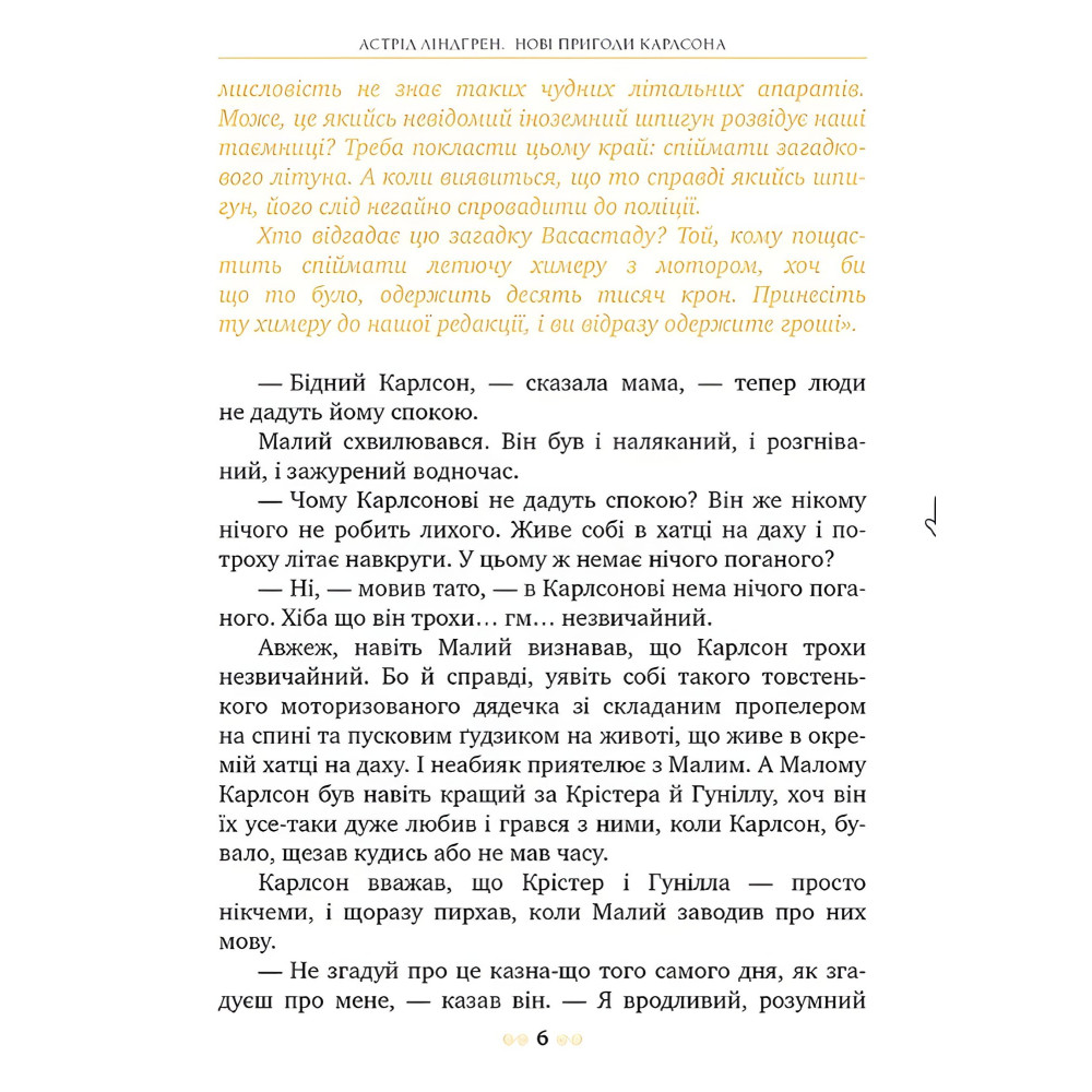 «Що це за таємнича й дивна річ літає над Стокгольмом?», — запитує столична газета. Нам би з Малим не знати: це наш герой Карлсон, що живе на даху! «Нові пригоди Карлсона, що живе на даху» — так називається третя книжка про твоїх улюблених героїв, написана через 13 років (1968) після першої. Що не сторінка — то нові оказії. Тож не барися, поринай у читання.