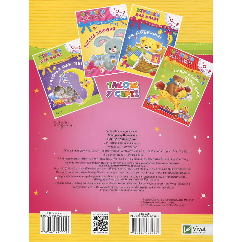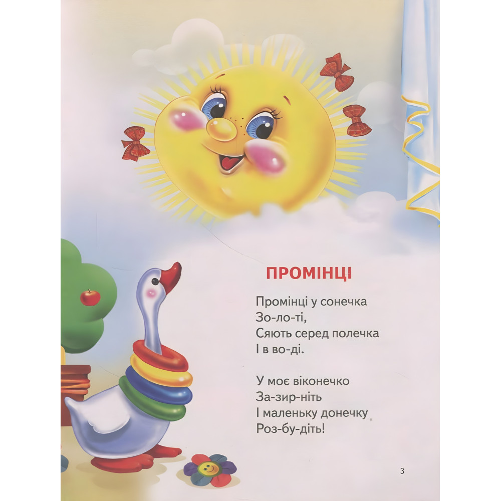 Яскраві, приємні ілюстрації та невеликі віршики обов'язково сподобаються малятам. Книжка підійде для найменшиньких, допоможе заснути або навпаки - розважить.