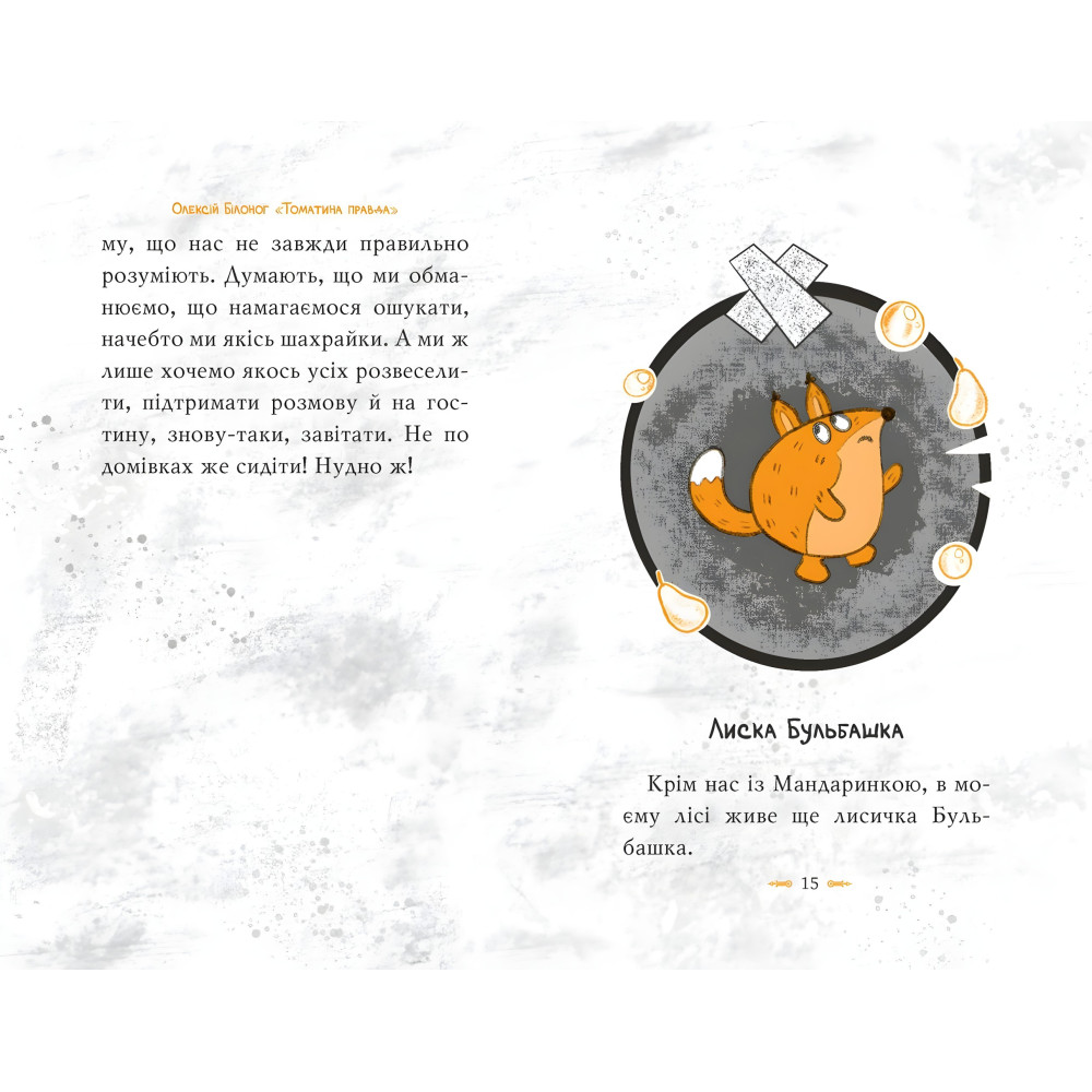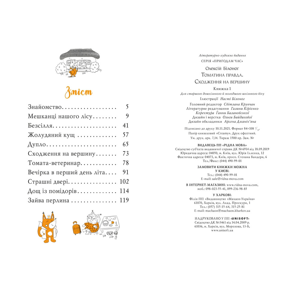 Живе в Десятому Лісі Томата, дуже енергійна лисичка. То вона газету видає, то лікувати звірів береться, то вирощує перлини в озері, то на вершину сходить… До всього їй є діло, і про все вона знає. Ось тільки не втямиш, коли Томата правду каже, а коли побріхує і фантазує. Зате з нею так весело! Може, саме тому мешканці Десятого Лісу прощають їй усі витівки?Читати про дивовижні пригоди Томати й інших звірят Десятого Лісу — справжнє задоволення для маленьких і навіть для дорослих читачів!