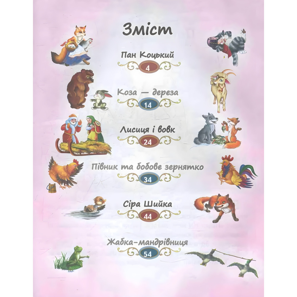 Збірка пропонує маленькому читачеві авторські та народні казки, в яких головні герої – тварини. У книзі ви зустрінетесь із хоробрим рак, який переміг Козу-дерезу, познайомитеся з маленькою качечкою Сірою Шийкою, дізнаєтеся, як лисичці вдалося обдурити вовка, а винахідливій жабі – політати разом із качками.Для дітей дошкільного віку.До збірки увійшли казки: Пан Коцький, Коза-дереза, Лисиця і вовк, Півник та бобове зернятко, Сіра Шийка, Жабка-мандрівниця.