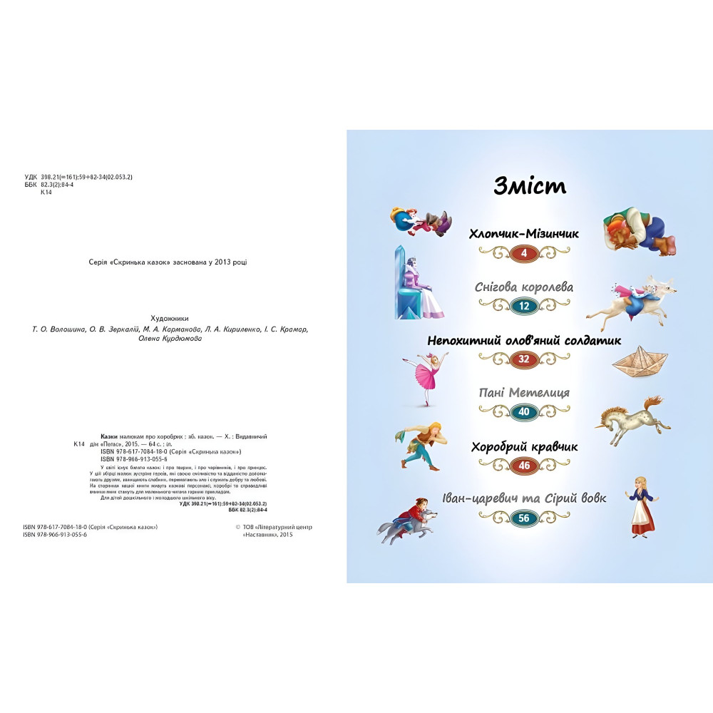 Від видавця:У світі існує багато казок: і про тварин, і про чарівників, і про принцес. У цій збірці малюк зустріне героїв, які своєю сміливістю та відданістю допомагають друзям, захищають слабких, перемагають зло і служать добра та любові. На сторінках нашої книги живуть казкові персонажі , хоробрі та справедливі вчинки яких стануть для маленького читача гарним прикладом.Для дітей дошкільного і молодшого шкільного віку.До збірки увійшли казки: "Хлопчик-Мізинчик", "Снігова королева", "Непохитний олов"яний солдатик", "Пані Метелиця", "Хоробрий кравчик", "Іван-царевич і Сірий вовк".