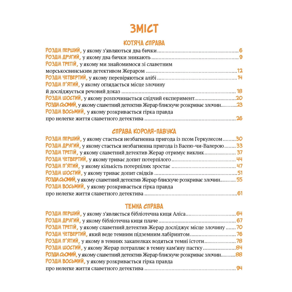Коли стаються таємничі злочини, усі тварини з довколишніх будинків, ба навіть ті, що живуть на вулиці, неодмінно звертаються до морського свина — детектива Жерара. Однак він знаний ласун, тож береться за справи тільки за умови смачненького гонорару.Разом із Жераром ти дізнаєшся, хто поцупив котячий сніданок, тікатимеш від голодних хижаків, з’ясуєш геть усе про невідоме страшидло, яке лякає добрих тварин, досліджуватимеш темні закапелки й боротимешся зі страхами, а найголовніше — навчишся миттю ловити зловмисників, застосовуючи дедукцію й логіку.