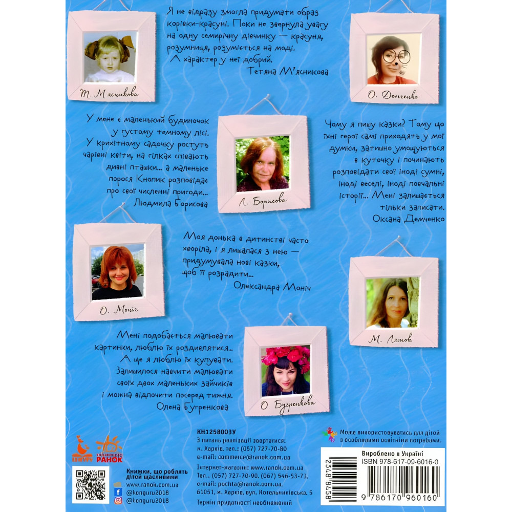 Ця збірка авторських казок стане чудовим подарунком для всієї родини! Малюка неодмінно зацікавлять яскраві ілюстрації й надзвичайні історії. Разом із героями казок він порине в дивовижні пригоди й дізнається, як важливо бути чесним, добрим, справедливим, подолає зайві страхи й погані звички. А дорослі матимуть змогу після читання поспілкуватися з дитиною на різні важливі тими, що матиме виховний ефект без жодних повчань. Тож затишну атмосферу в родині гарантовано.