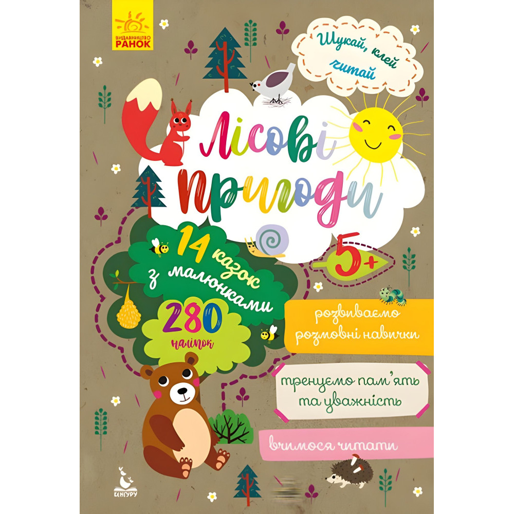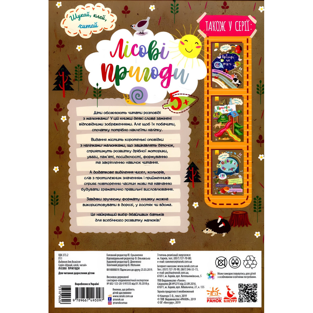 Дана книжка є однією з серії яскравих книжок зручного формату з наліпками, цікавими оповідками і завданнями. Їх зручно використовувати в дорозі, у гостях чи вдома. Книжки сприяють розвитку дрібної моторики, поглибленню навичок читання, повторенню кольорів, чисел, прийменників.У серії також представлені: Шукай, клей, читай. Пригоди звірят на фермі, Шукай, клей, читай. Пригоди звірят у місті, Шукай, клей, читай. Підводні пригоди.