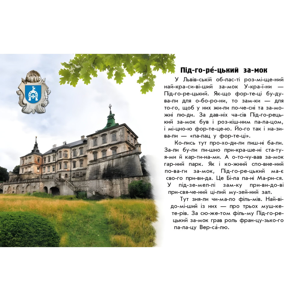 У цій книжці з серії "Чи-та-ю про Україну" зібрані короткі оповідання, які познайомлять маленьких читачів, що тільки навчаються читати, з замками та фортецями нашої України. Для вибудови правильного ритму та розподілу дихання усі слова в текстах поділені на склади. Чудові реалістичні картинки доповнять враження від текстів. За допомогою текстів та ілюстрацій малюк не тільки здобуде навичок читання, а й познайомиться з рідним краєм.