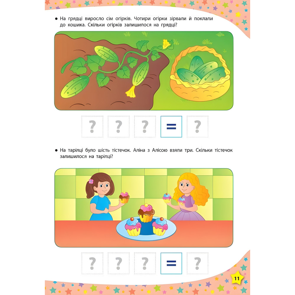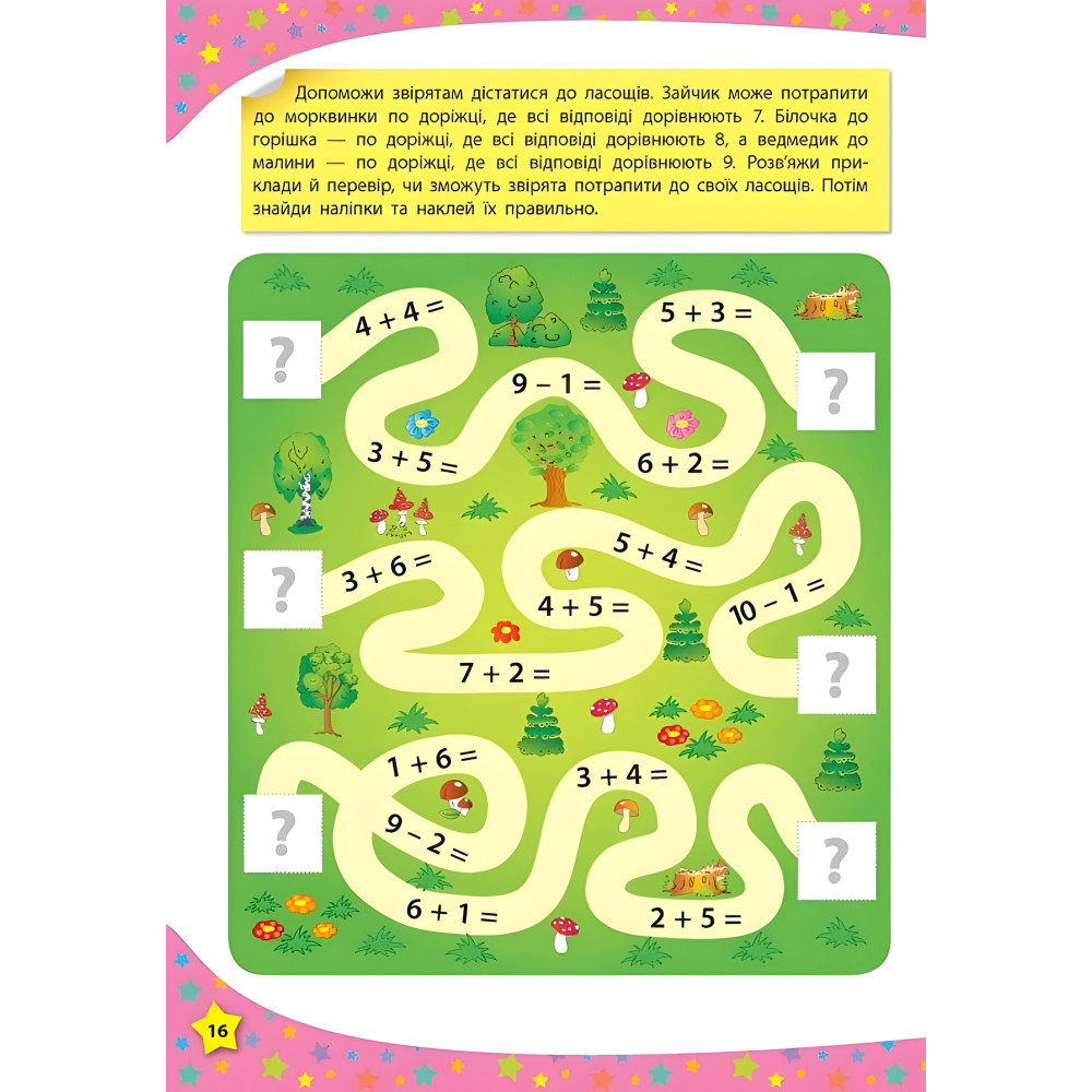 Ця книга допоможе вашій дитині згадати числа від 1 до 10 і основні геометричні фігури, навчитися вимірювати довжину предметів за допомогою лінійки, порівнювати предмети та числа, вирішувати нескладні приклади та завдання. Книга містить прості та цікаві завдання для розвитку уяви, логіки, мислення та дрібної моторики пензля. Відповідь на кожне завдання малюки зможуть знайти серед 117 наклейок, що містяться в книзі.