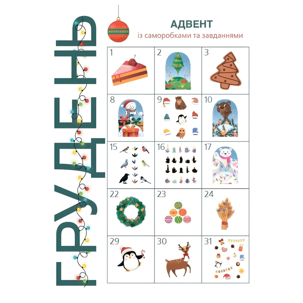Книга «Адвент із саморобками та завданнями» для дітей 3–4 років поєднує веселу гру з навчанням. Малюки виконують різноманітні завдання, розвивають дрібну моторику, увагу та логічне мислення. Кожен день перед святами можна виконувати нове завдання або виготовити цікаву саморобку.