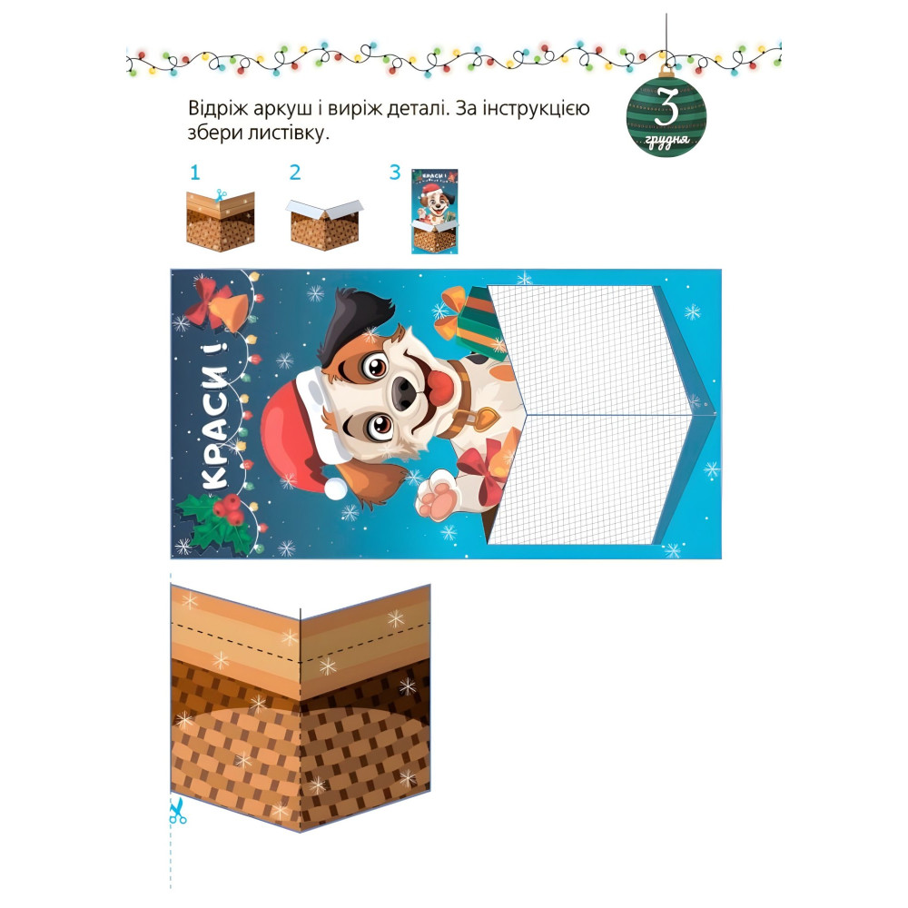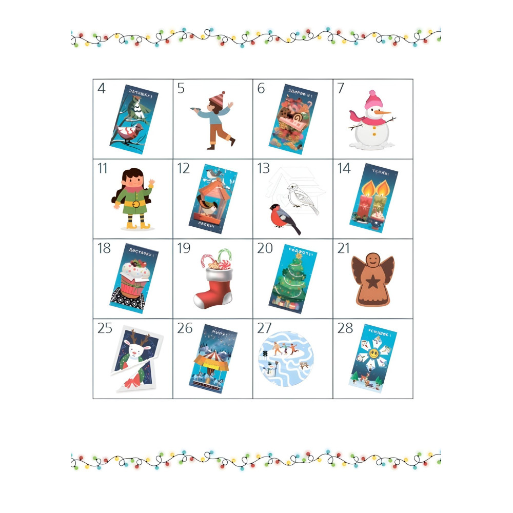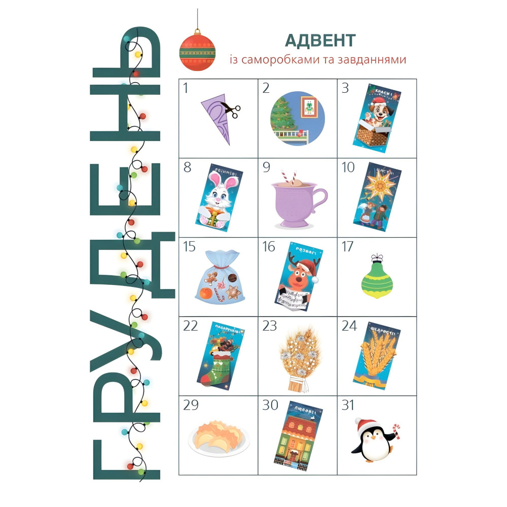 Книга «Адвент із саморобками та завданнями» для дітей 4–6 років поєднує веселу гру та навчання. Малюки виконують цікаві завдання та виготовляють саморобки, розвиваючи дрібну моторику, увагу та логічне мислення. Кожен день перед святами можна виконати нове завдання або створити оригінальну поробку.