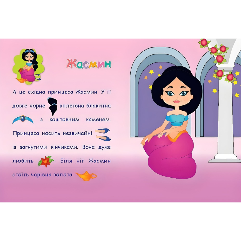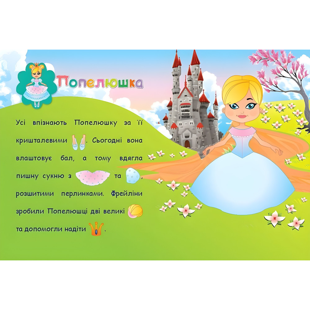 Разом з цим виданням малюк порине у чарівний світ разом із казковими принцесами. Прочитайте разом цікаві описи Жасмин, Попелюшки чи Білосніжки! Користуючись підказками, дитина зможе знайти і додати малюнку туфельки, шпильки або зачіски принцес та інші деталі, щоб зібрати повне зображення. Щоб правильно розмістити наклейки, звертайте увагу на зразок. А ще з наклейок можна зібрати нову, ні на кого не схожу принцесу! Створюючи кольорову аплікацію, дитина розвиває дрібну моторику та вчиться співвідносити частину та ціле.
