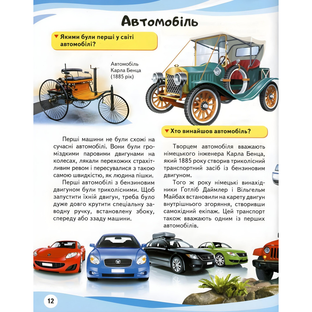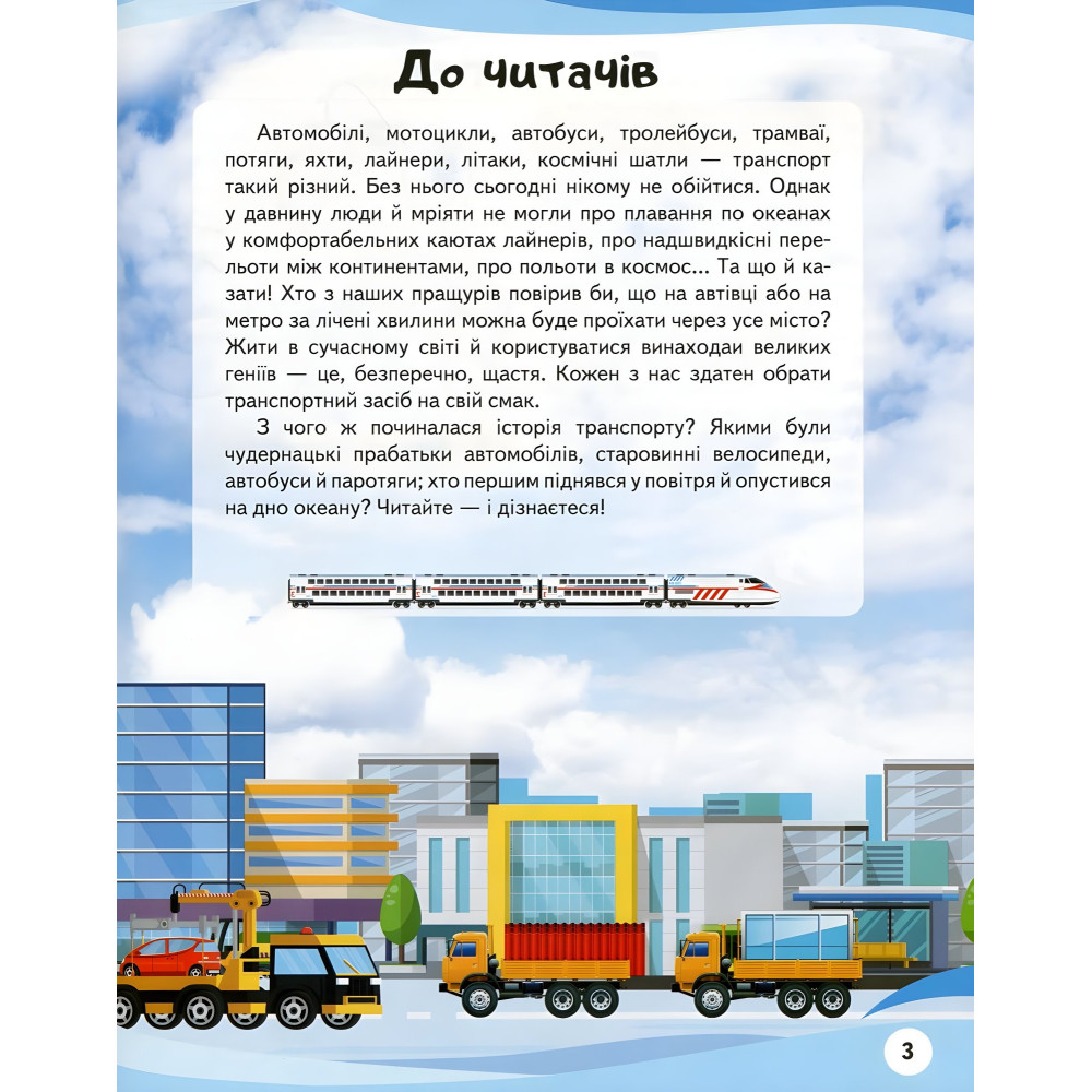 Автомобілі, мотоцикли, автобуси, тролейбуси, трамваї, потяги, яхти, лайнери, літаки, космічні шатли - транспорт такий різний. Без нього сьогодні нікому не обійтися.З чого починалася історія транспорту? Якими були дивовижні прабатьки автомобілів, старовинні велосипеди, автобуси і паровози, хто першим піднявся в повітря і опустився на дно океану? Саме про це і про багато іншого наша енциклопедія!