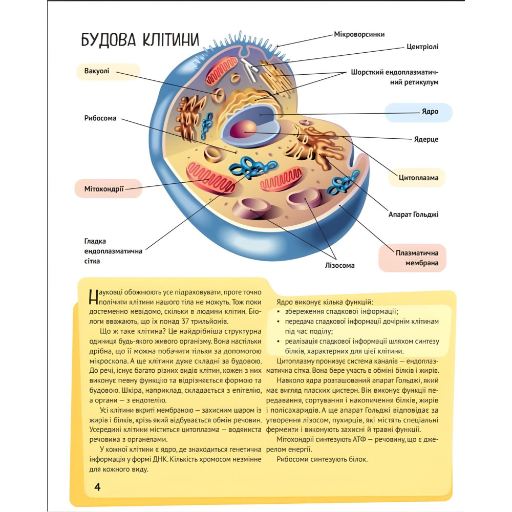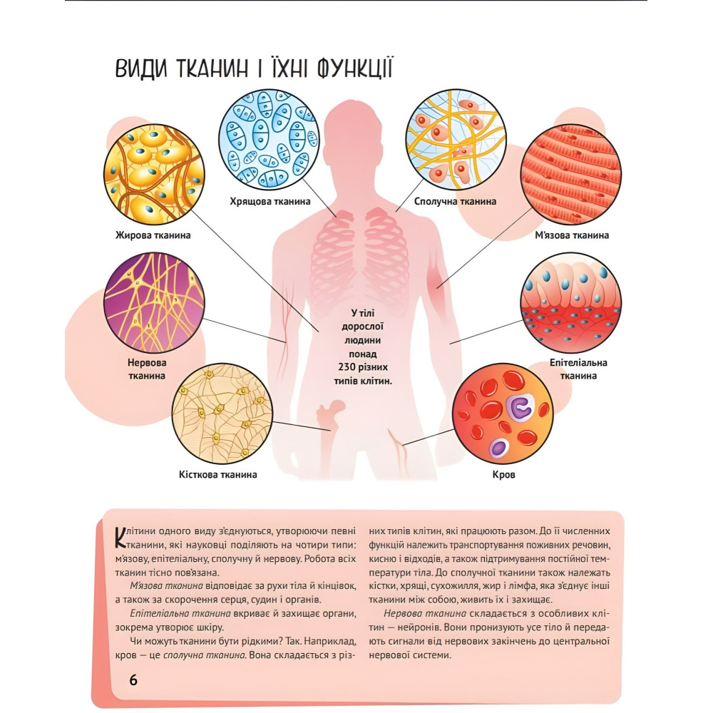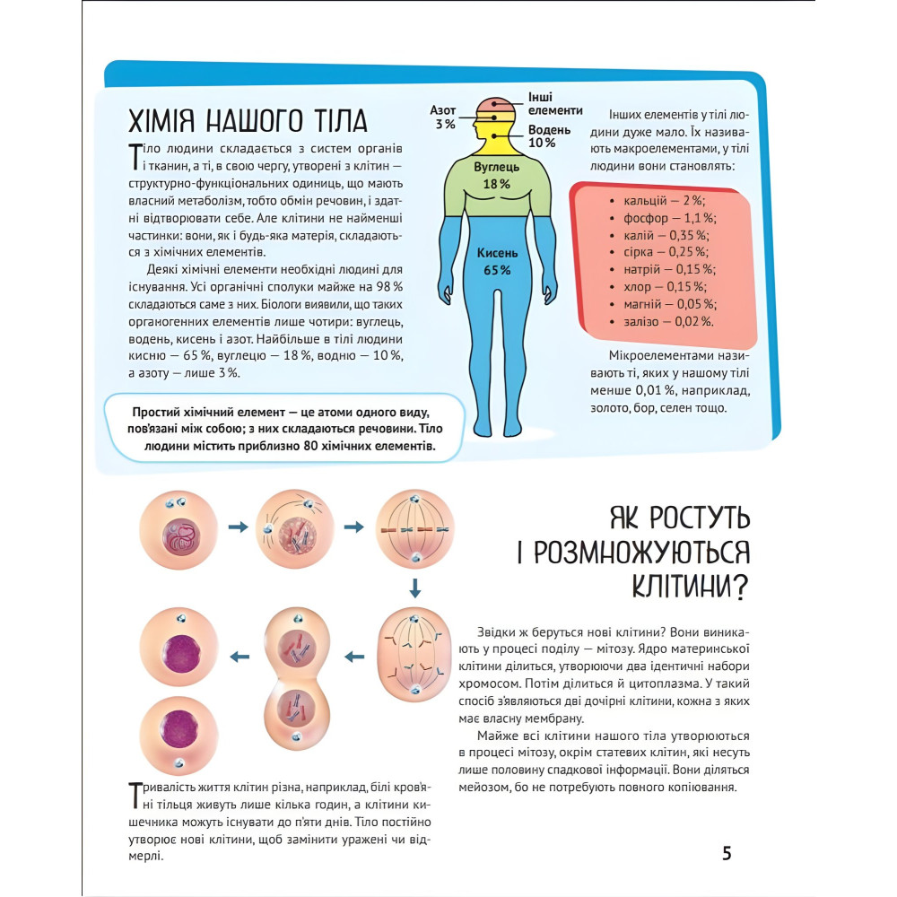 Ця ілюстрована енциклопедія відкриє юним читачам найцікавіші таємниці людського тіла: · Що таке ДНК і гени? · Навіщо людині їсти та пити? · Де зберігається пам’ять? · Що таке рефлекси? · Як ми отримуємо інформацію зовні? Та багато іншого. Наповнена важливими фактами, докладними схемами і приголомшливими фотографіями, ця книжка досліджує злагоджену роботу найцікавішого механізму, який лише існував у Всесвіті.
