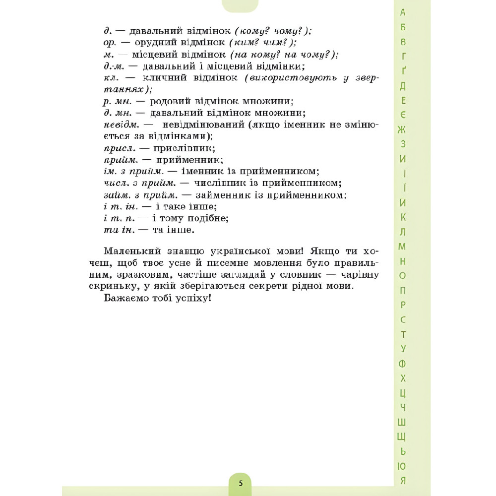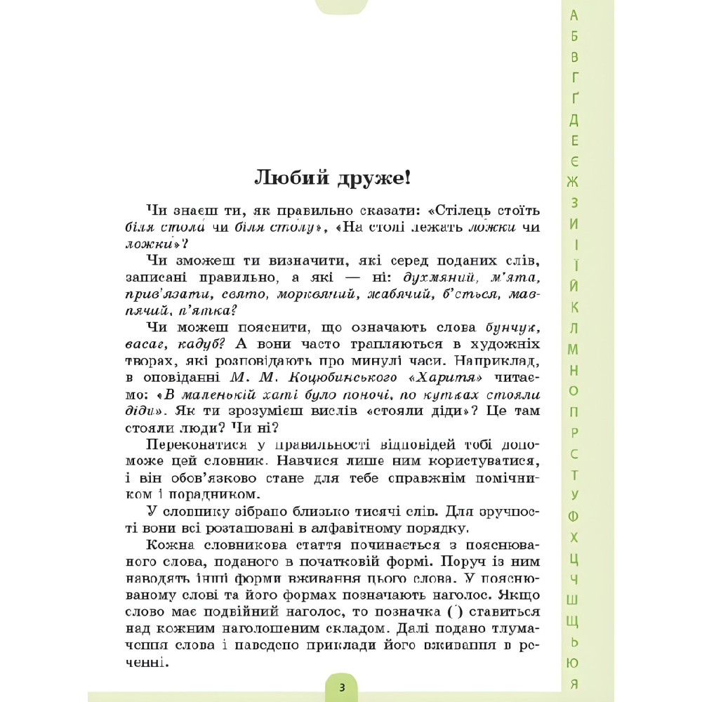 Одна з ключових компетентностей учнів Нової української школи – вільне володіння рідною української мовою, правильна усна та писемна мова.Словник допоможе учням молодших класів переконатися у правильності написання та вимови українських слів. У словнику зібрано близько тисячі слів. Для зручності вони всі розташовані за абеткою. Кожна словникова стаття видання починається з пояснюваного слова, поданого в початковій формі. Поруч із ним наводять інші форми вживання цього слова. У пояснюваному сло ві та його формах позначають наголос. Далі подано тлумачення слова і наведено приклади його вживання в реченні. У словнику також трапляються омоніми — слова, які звучать або пишуть однаково, але мають різні значення. До кожного з таких слів подано окрему статтю. Деякі слова супроводжуються ілюстрацією.