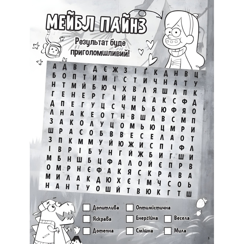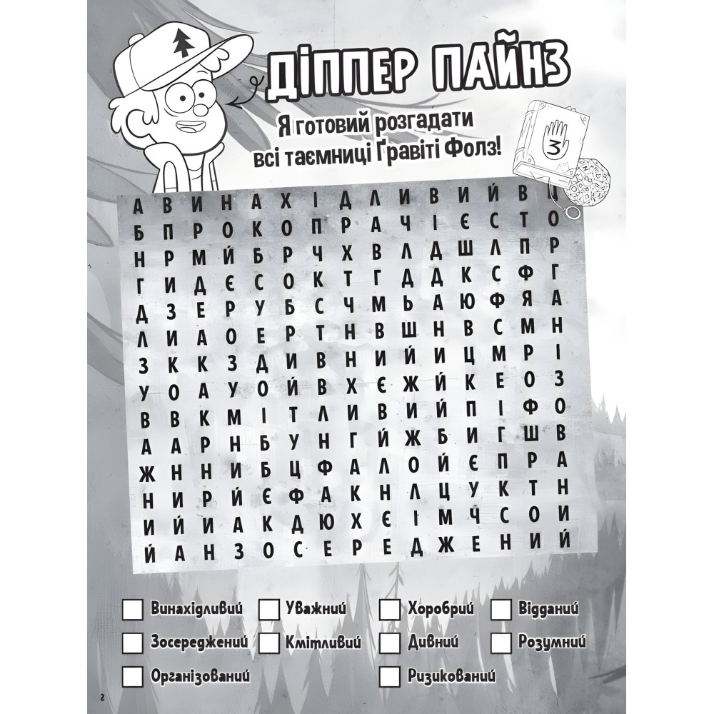 Цікаво, що приховує ця книжка? Авжеж загадкові пригоди близнюків Діппера та Мейбл і їхніх друзів. На сторінках безліч головоломок, розфарбовок й, звичайно, таємниць. Приготуйтеся вирушати у цікаву подорож разом із улюбленими персонажами Ґравіті Фолз!