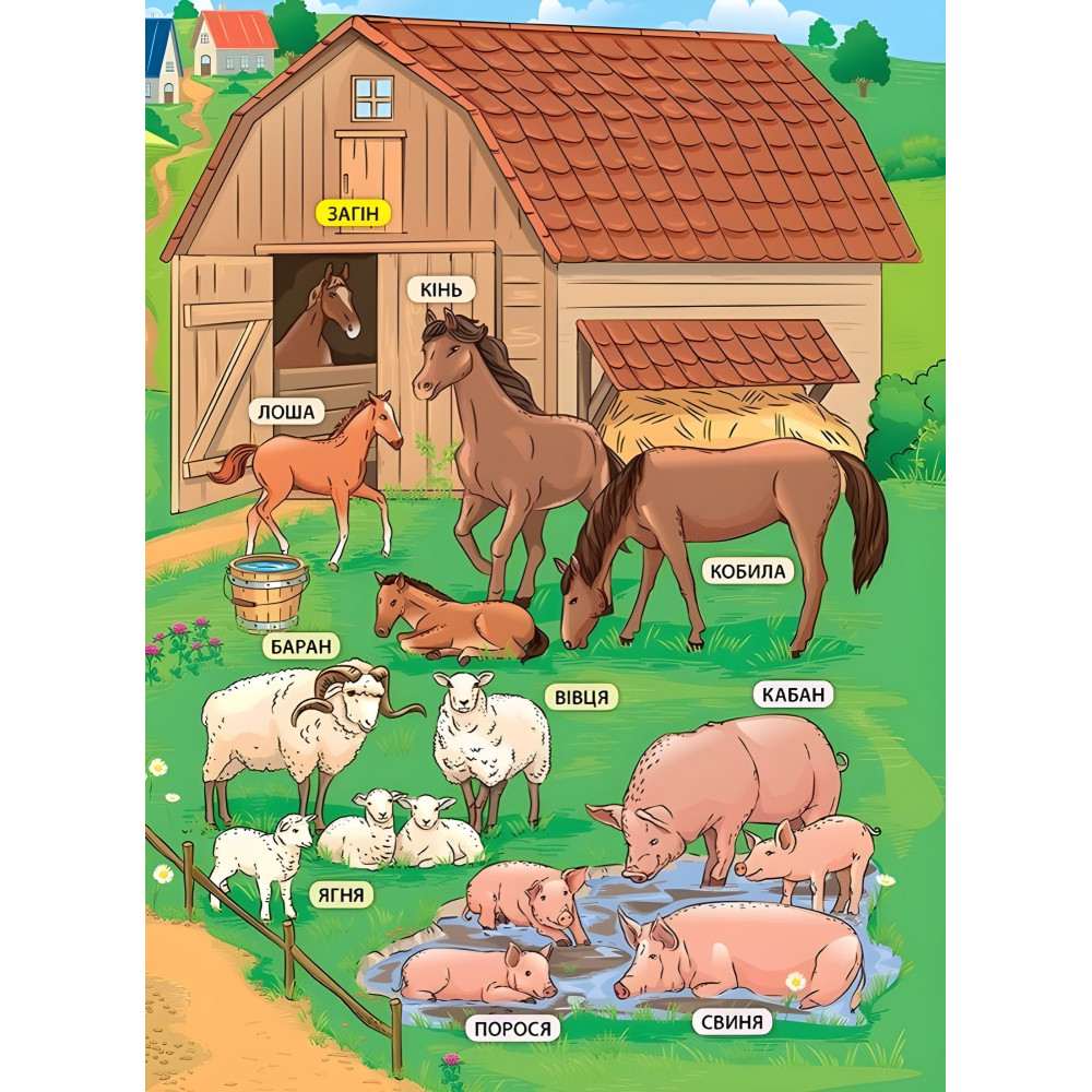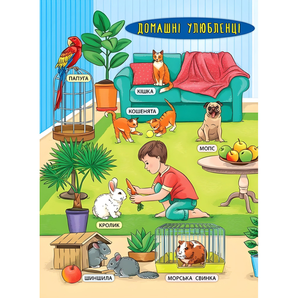 Це видання познайомить дитину з тваринами, що живуть поруч із людиною, — свійськими тваринами та птаха, а також домашніми улюбленцями. У кінці книги малюк знайде захопливу настільну гру, що допоможе весело провести час із друзями, закріпити здобуті знання та пограти з яскравими наліпками, що містяться у виданні.