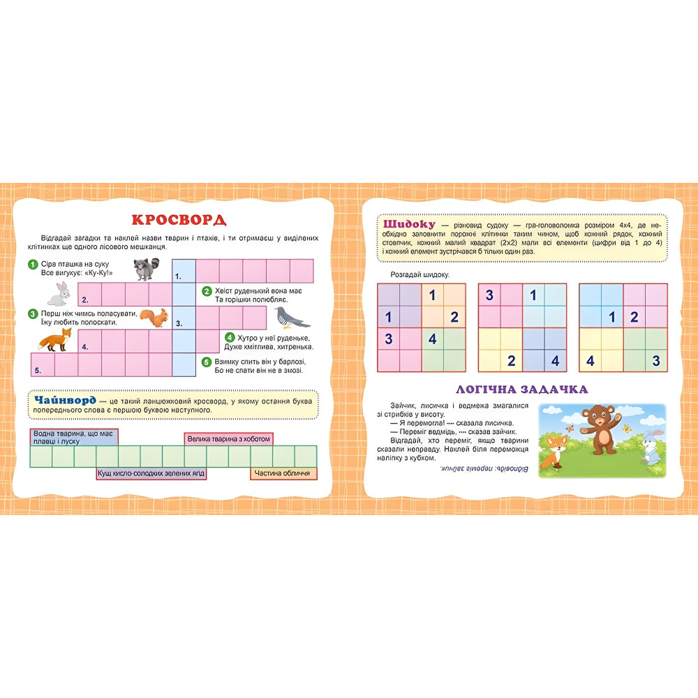 Ця книжка складається із різних видів головоломок на будь-який смак. Головоломки — цікаві завдання, для вирішення яких потрібна кмітливість, їх розв`язування — прекрасний спосіб для тренування логічного мислення, пам`яті й уваги. Дітям подобаються такі завдання: вони швидко пропонують рішення, а знайдені відповіді викликають у них захоплення і радість. Головоломки насправді є вітамінками для розуму, тож розплутуйте їх із задоволенням!